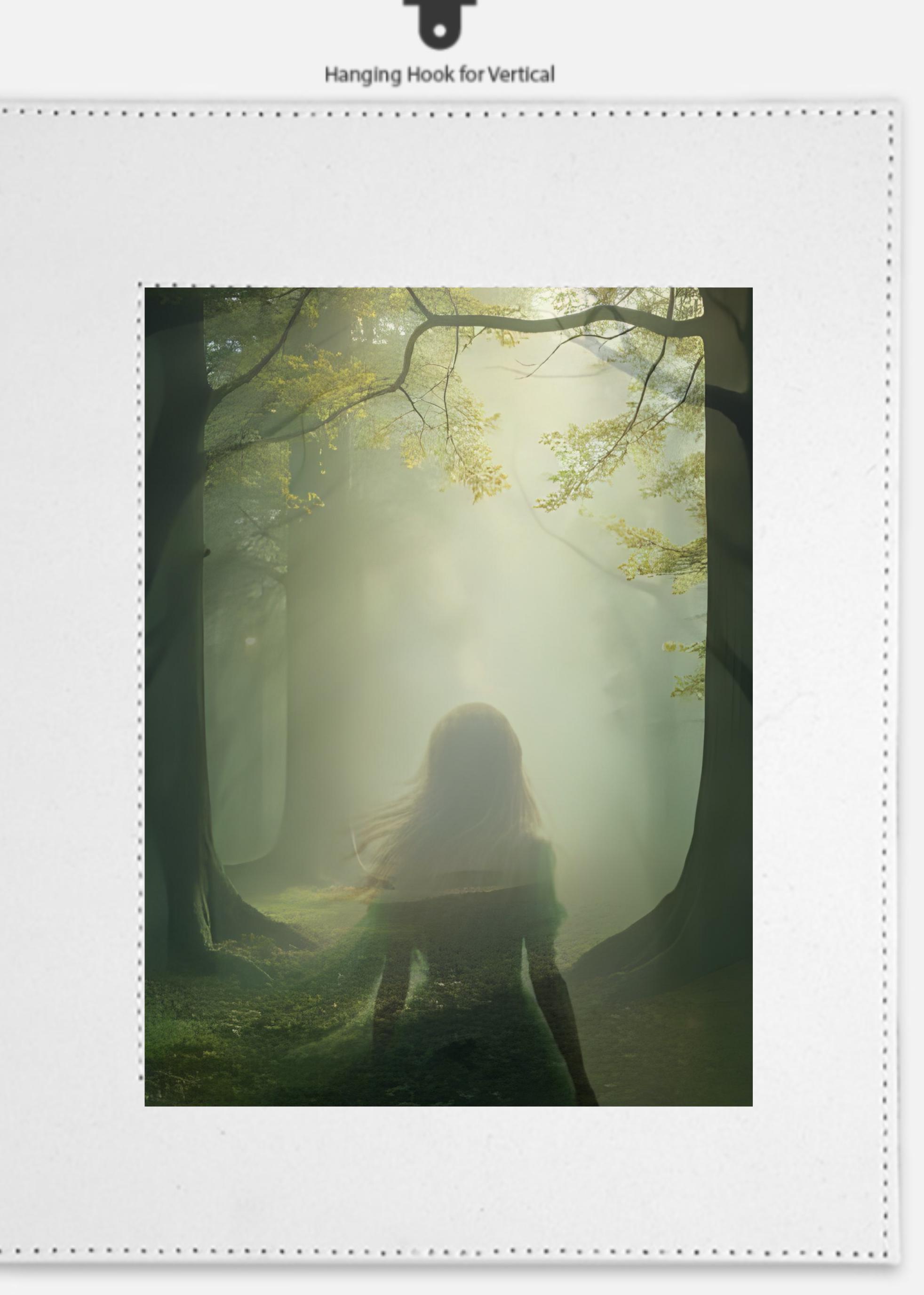 * Minimalist design featuring mystical silhouettes against a dreamy, fog-filled woodland backdrop