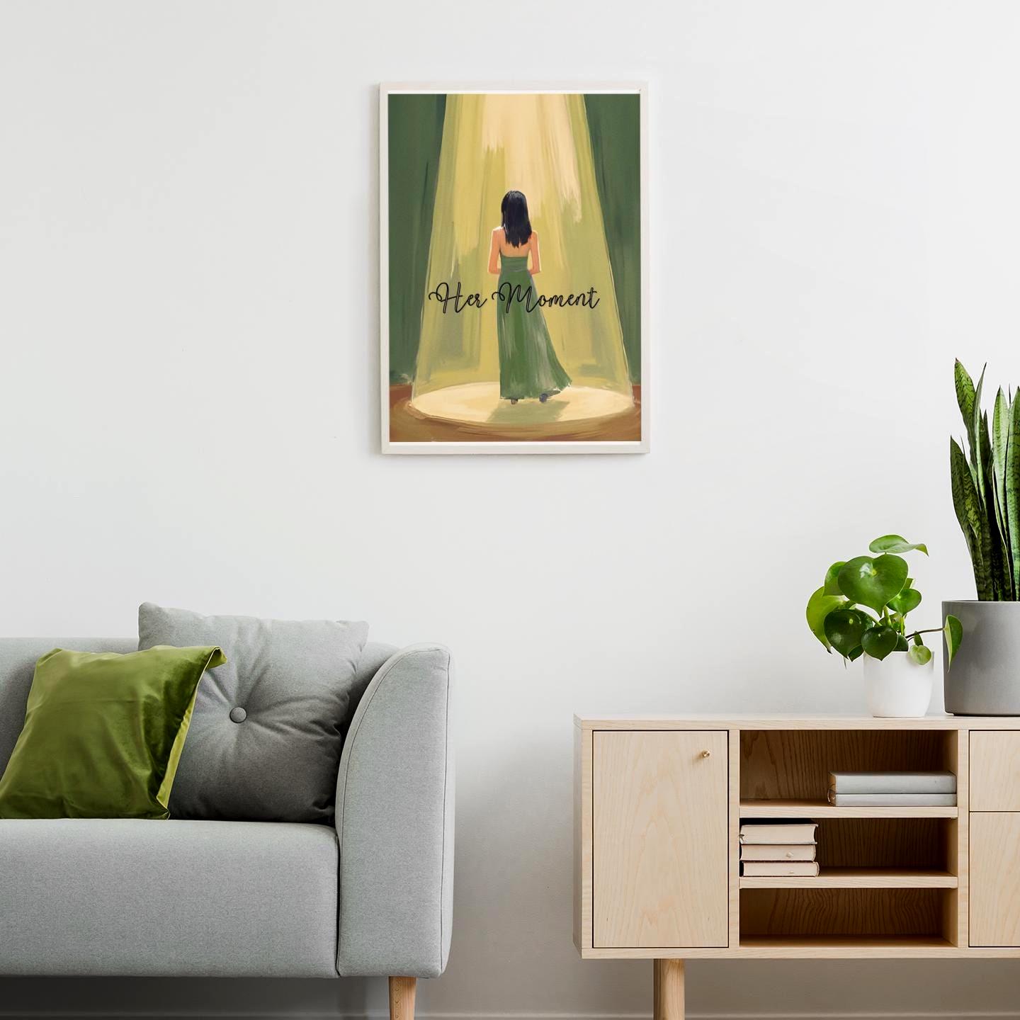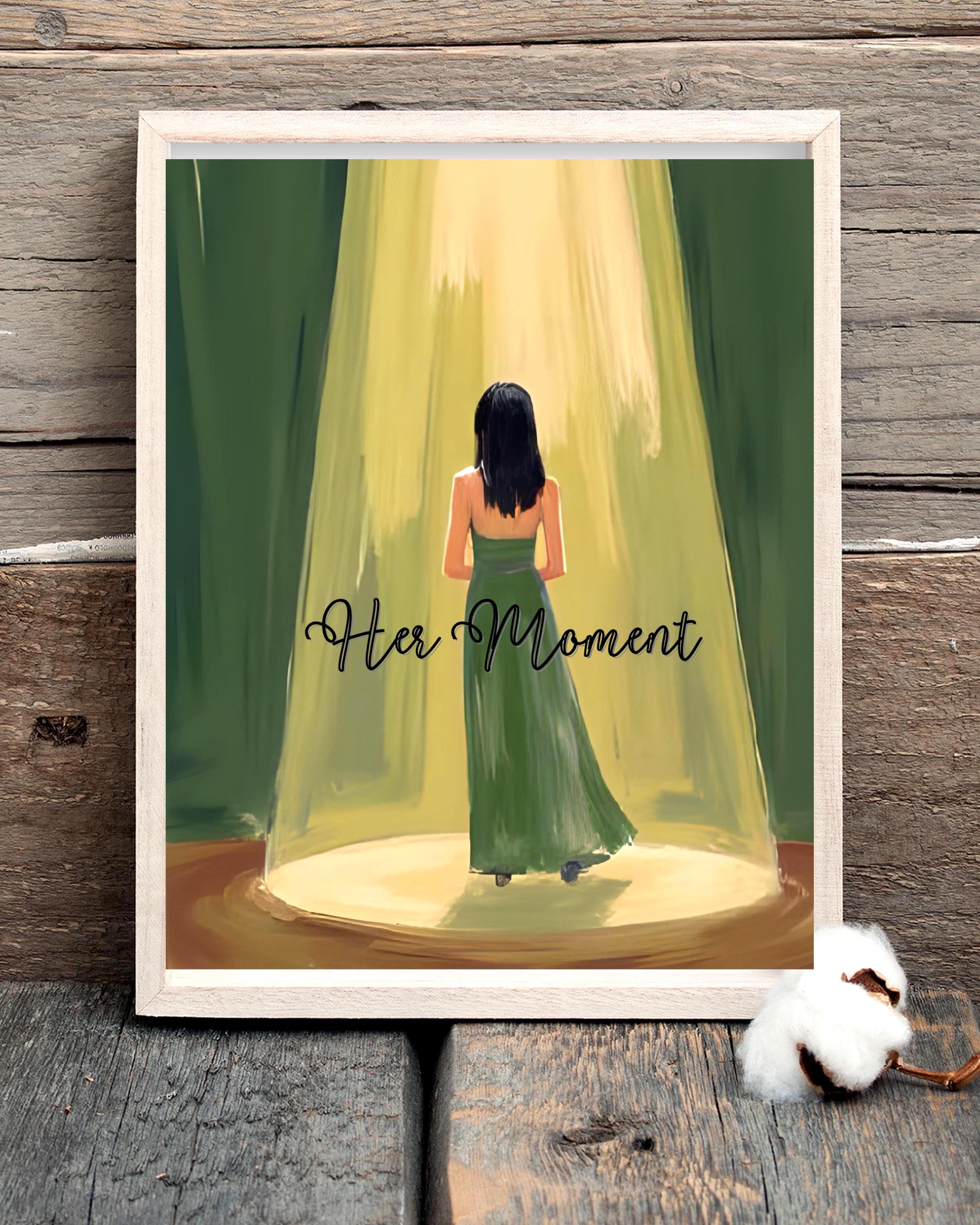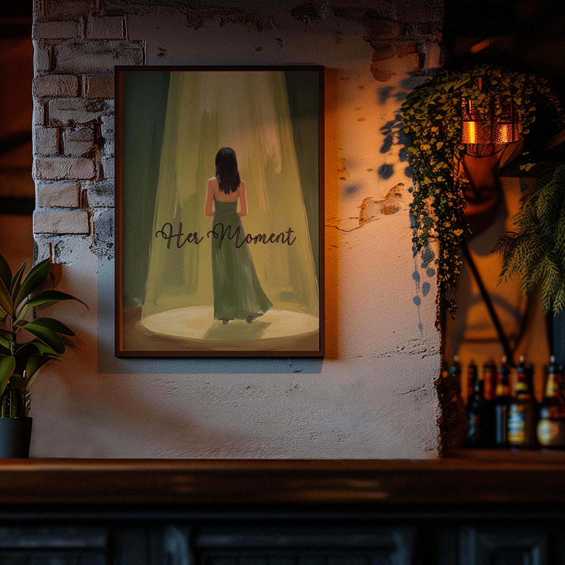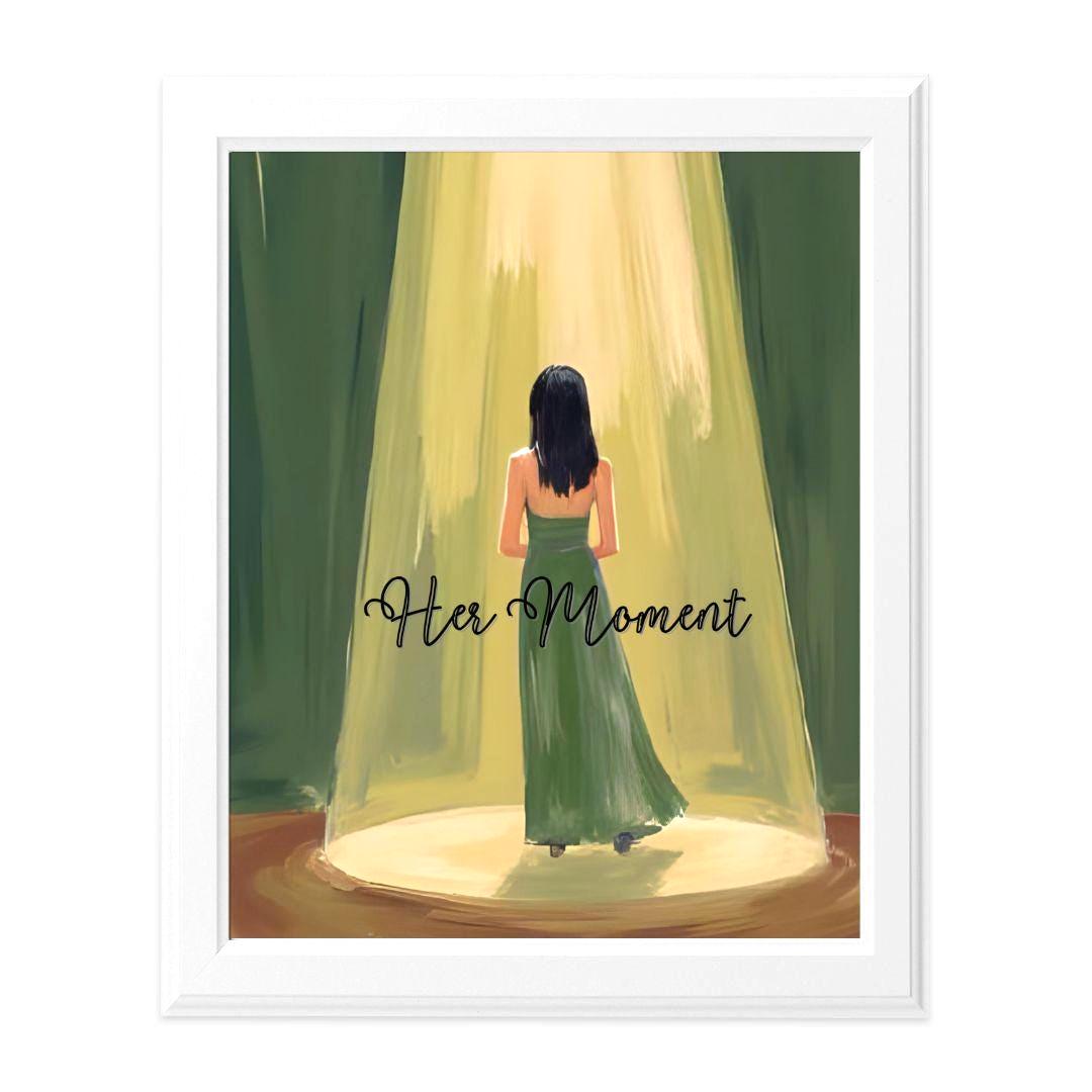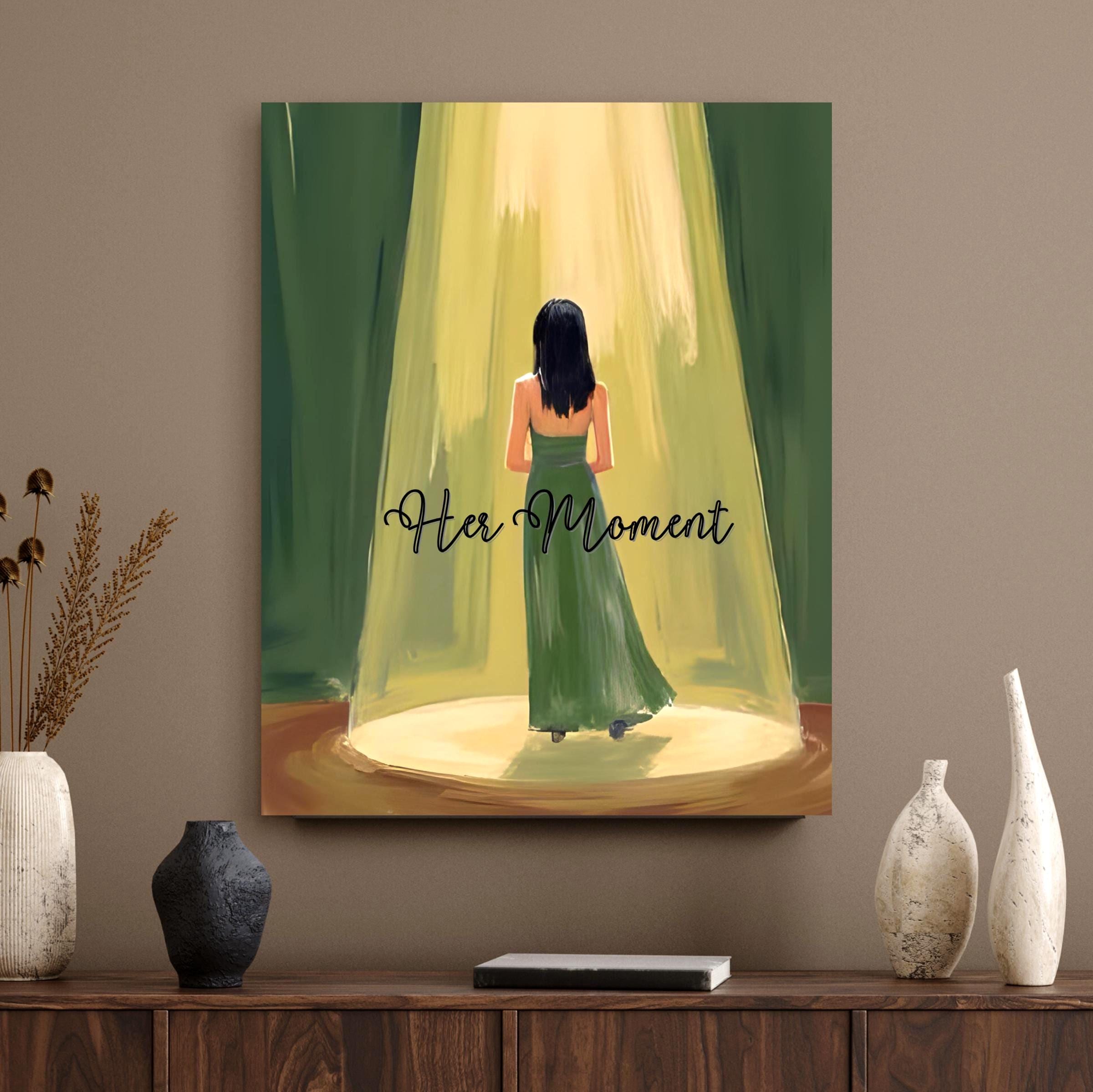 This stunning woman wall art features an elegant figure in a green dress standing in a beam of light, creating an inspirational female artwork perfect as a birthday present or housewarming gift. The "Her Moment" print serves as beautiful theater decoration that captures the essence of a stage actor's presence, making it an ideal display piece for performance spaces or homes of theater enthusiasts.