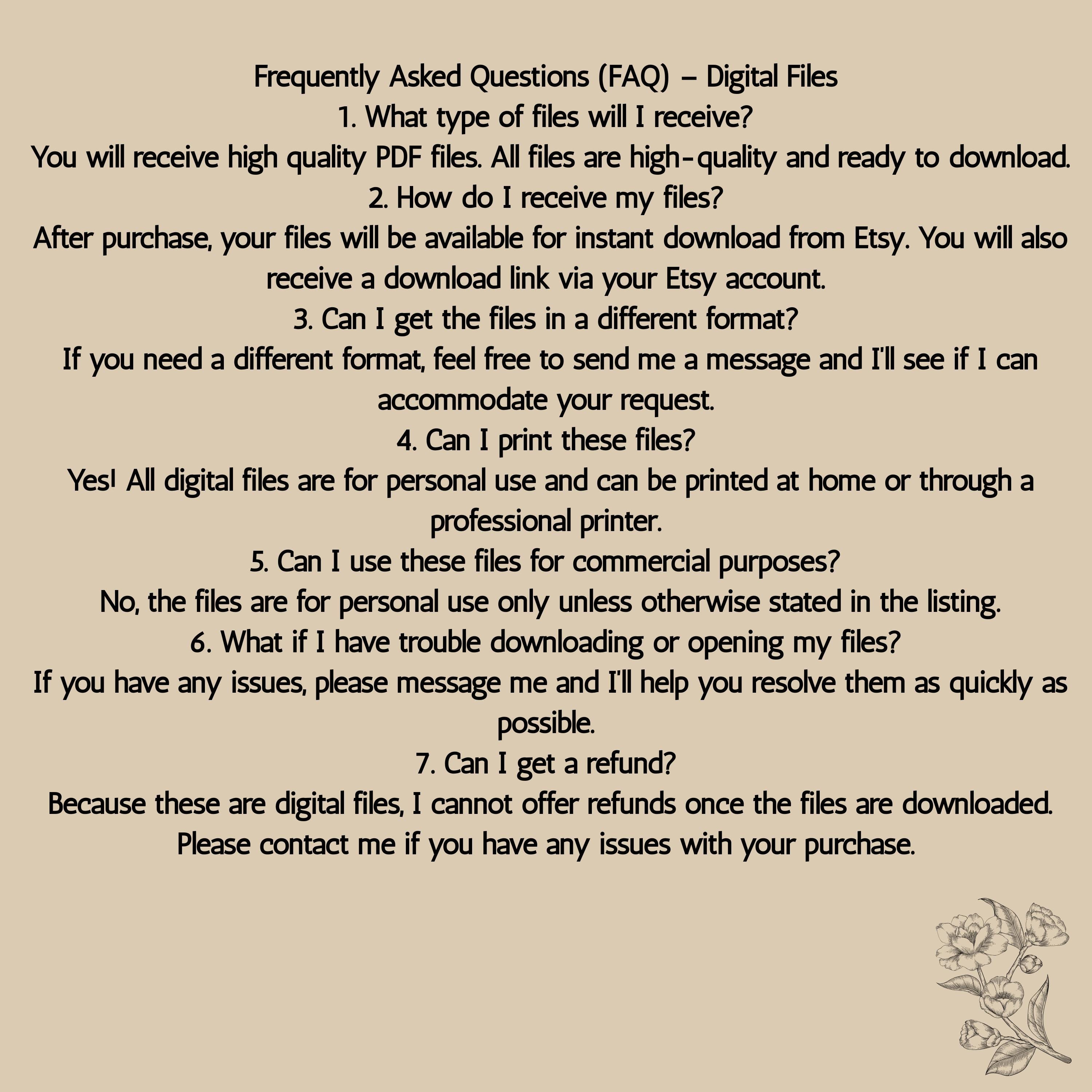 Because these are digital files, I cannot offer refunds once the files are downloaded. Please contact me if you have any issues with your purchase.