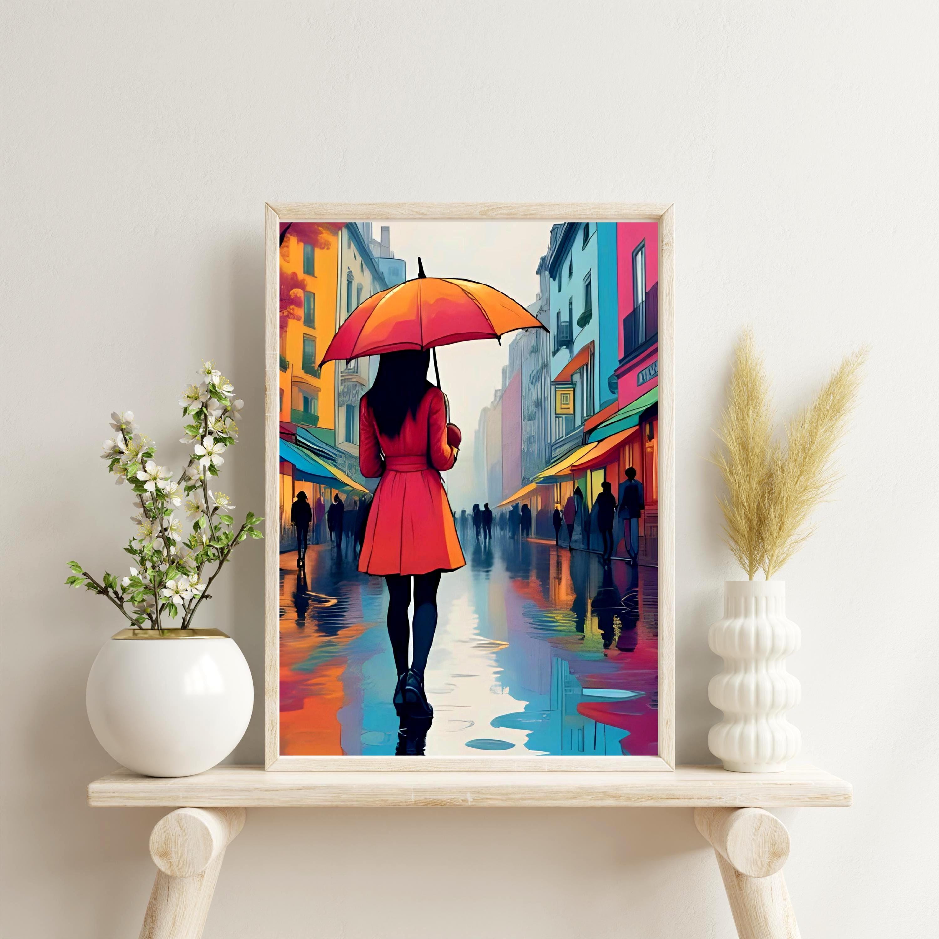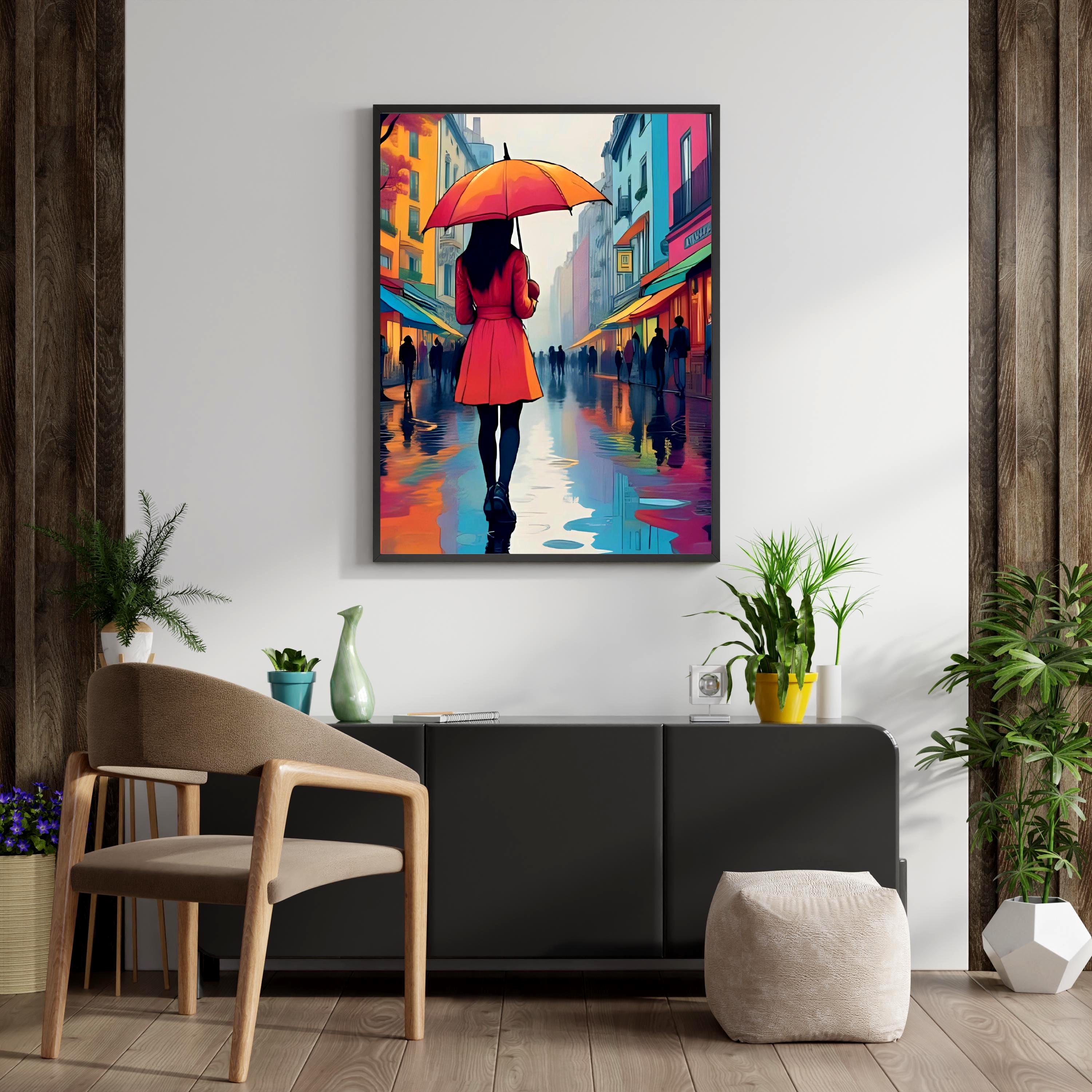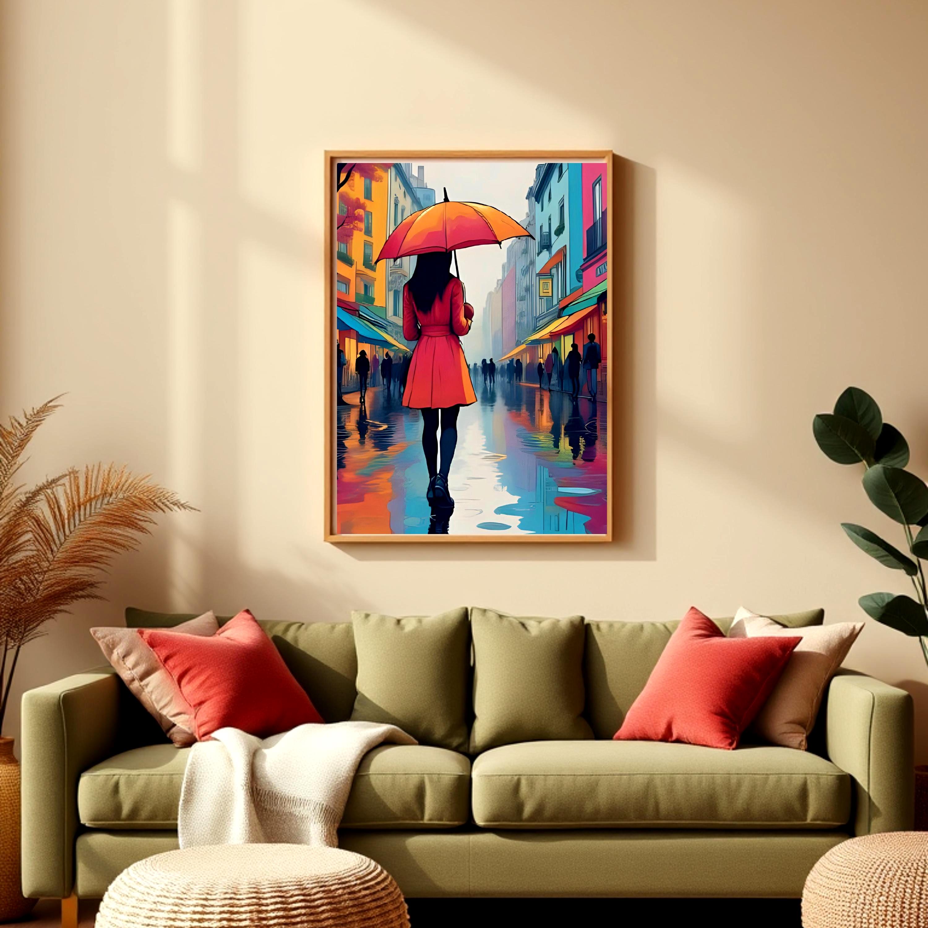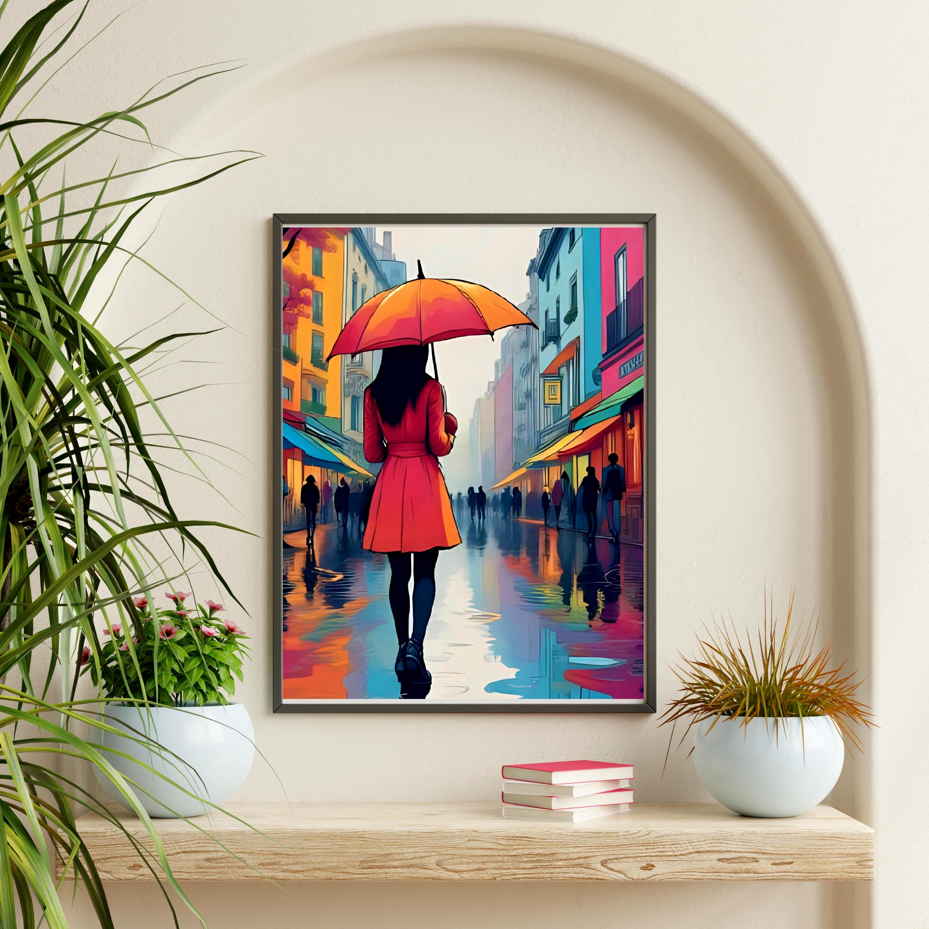 Transform your bedroom wall with this stunning rainy city art print featuring a vibrant red coat and umbrella illustration that captures the beauty of an urban scene in the rain. This modern print showcases a colorful rain artwork with reflective pavement details, creating a captivating digital wall decoration that adds depth and atmosphere to any space. This painting brings the charm of a rainy cityscape into your home with its artistic representation of urban life.
