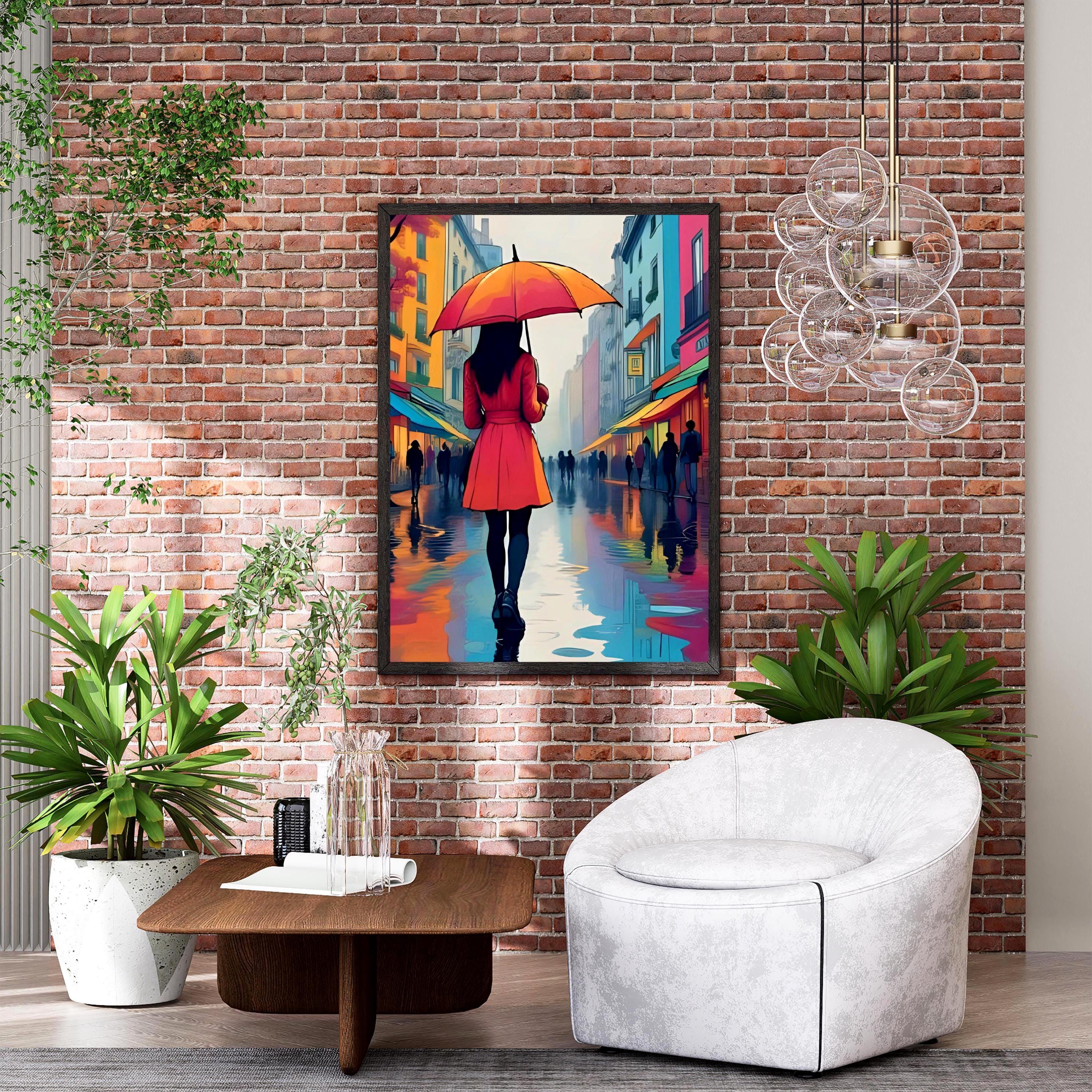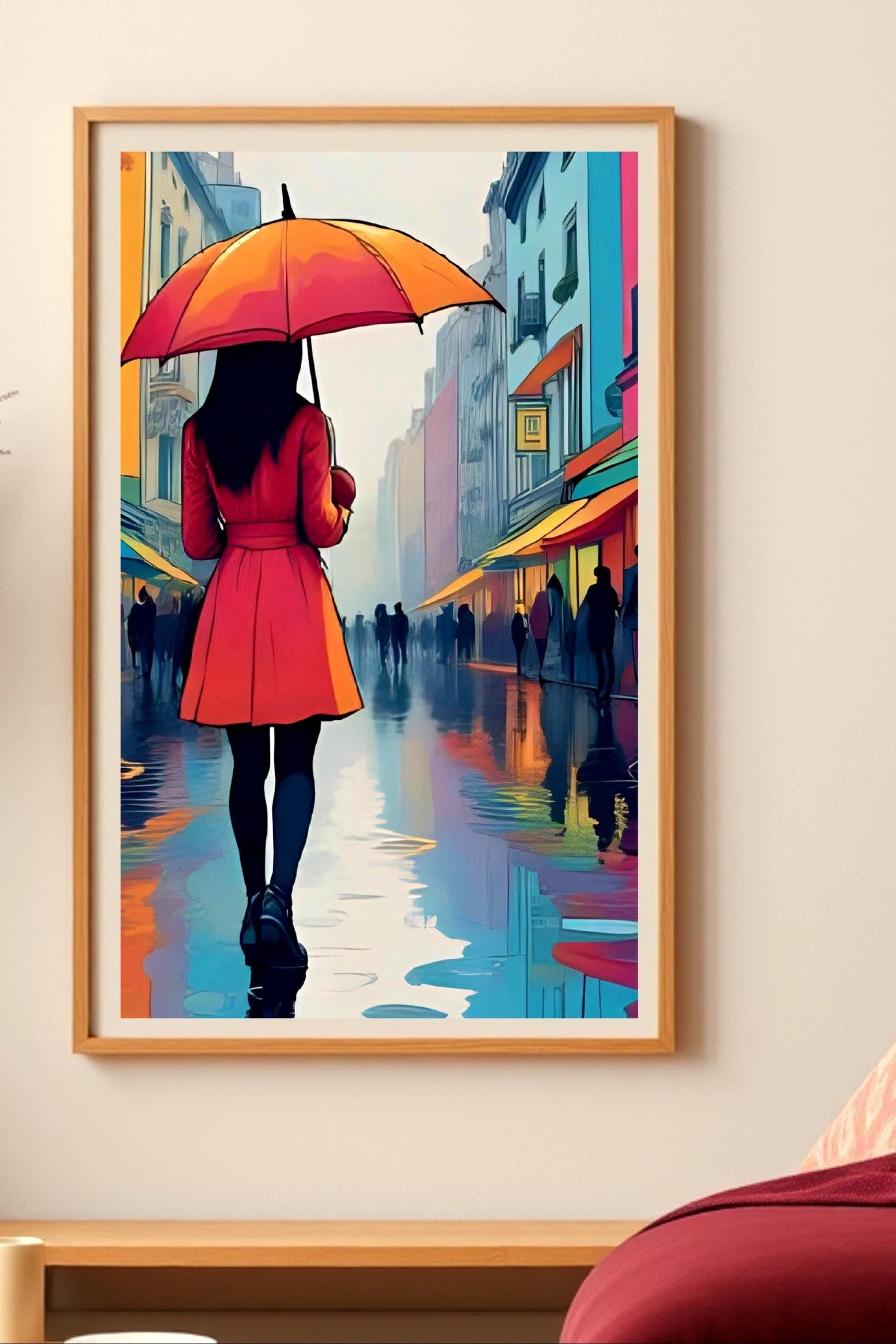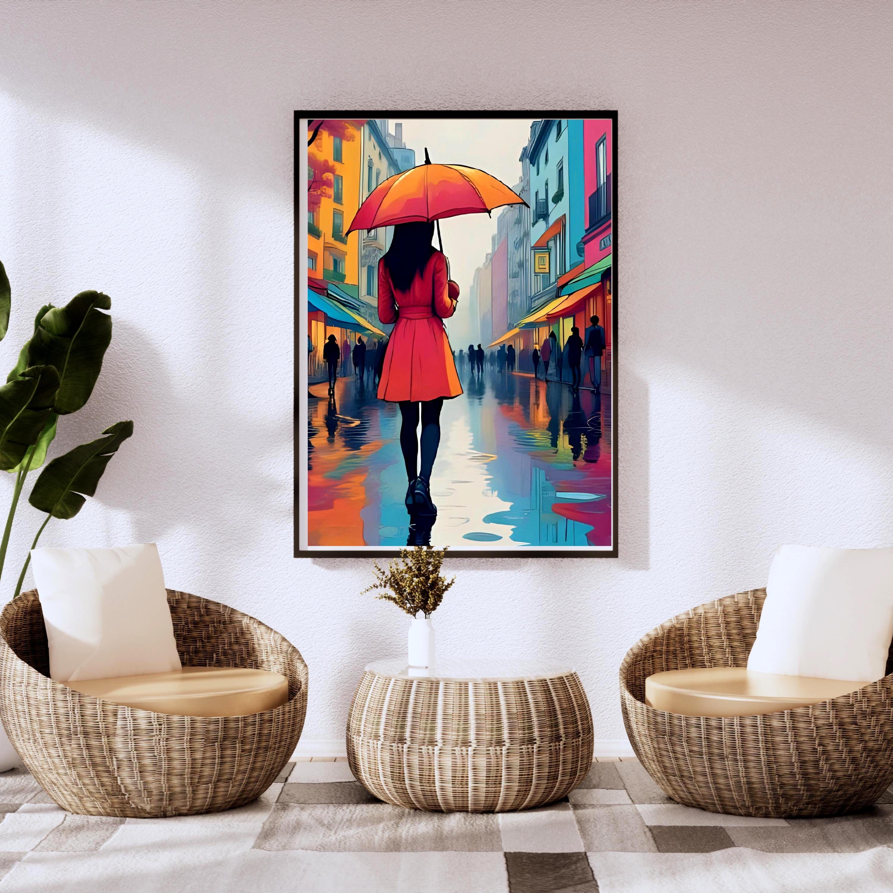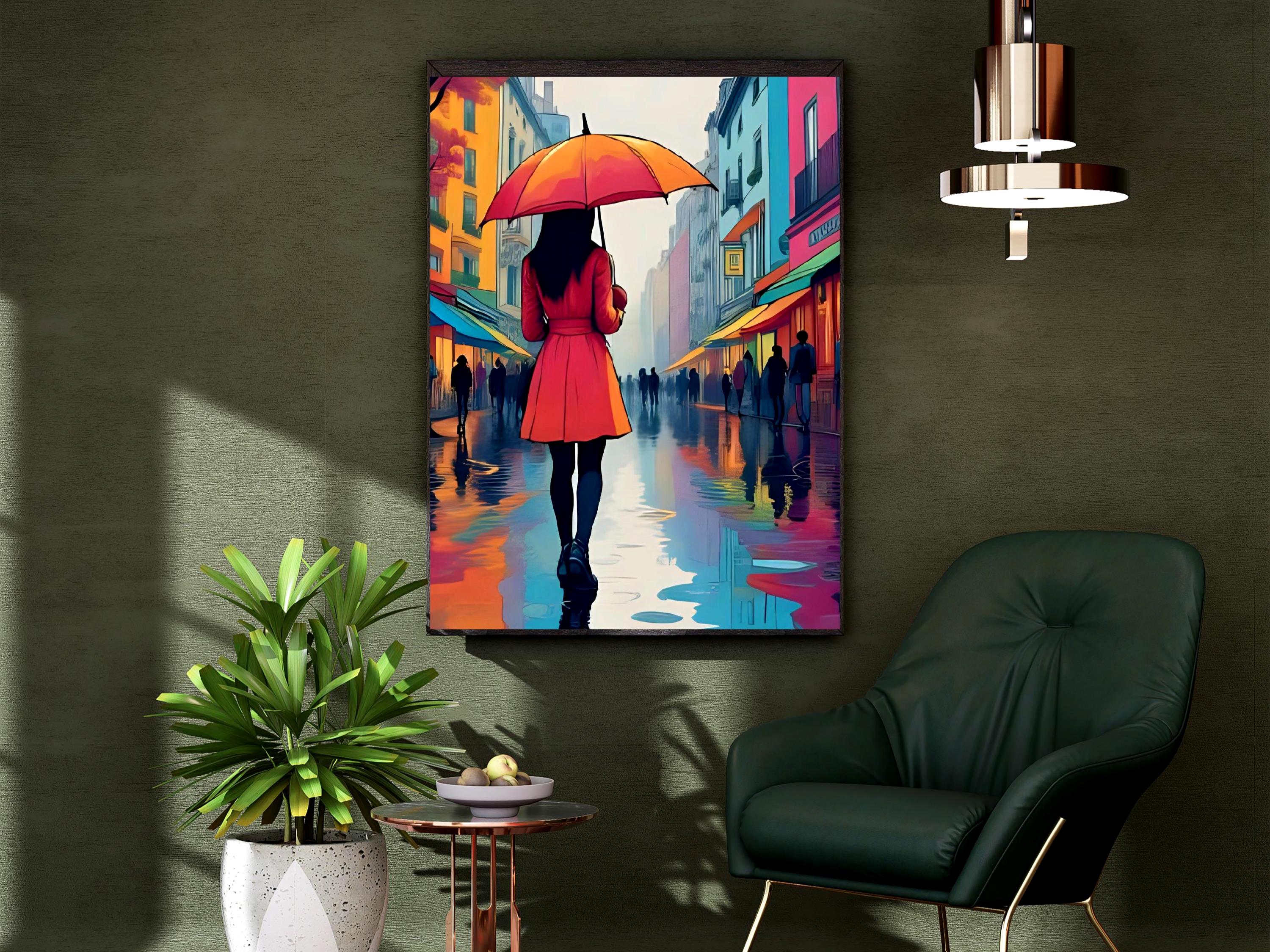 Transform your bedroom wall with this stunning rainy city art print featuring a vibrant red coat and umbrella illustration that captures the beauty of an urban scene in the rain. This modern print showcases a colorful rain artwork with reflective pavement details, creating a captivating digital wall decoration that adds depth and atmosphere to any space. This painting brings the charm of a rainy cityscape into your home with its artistic representation of urban life.