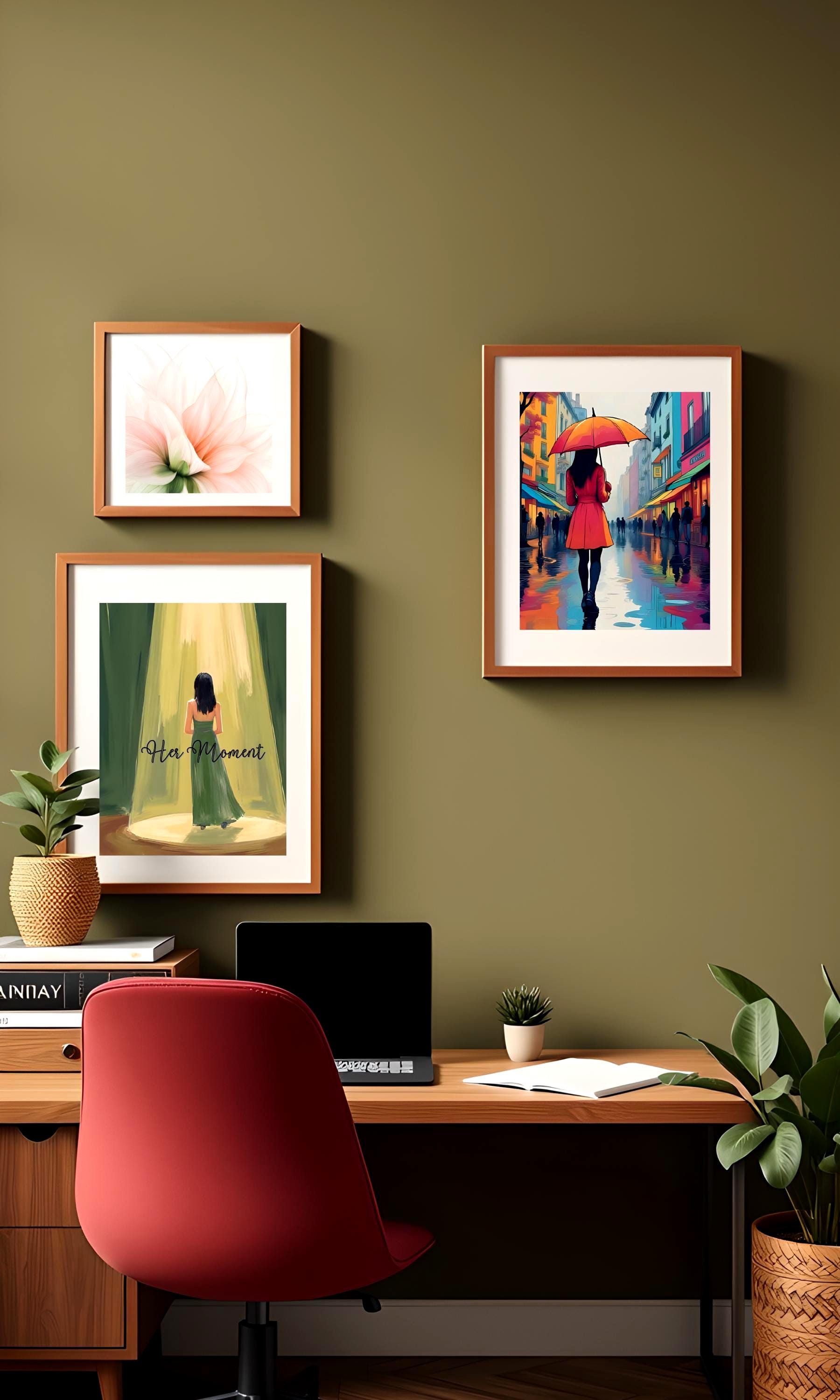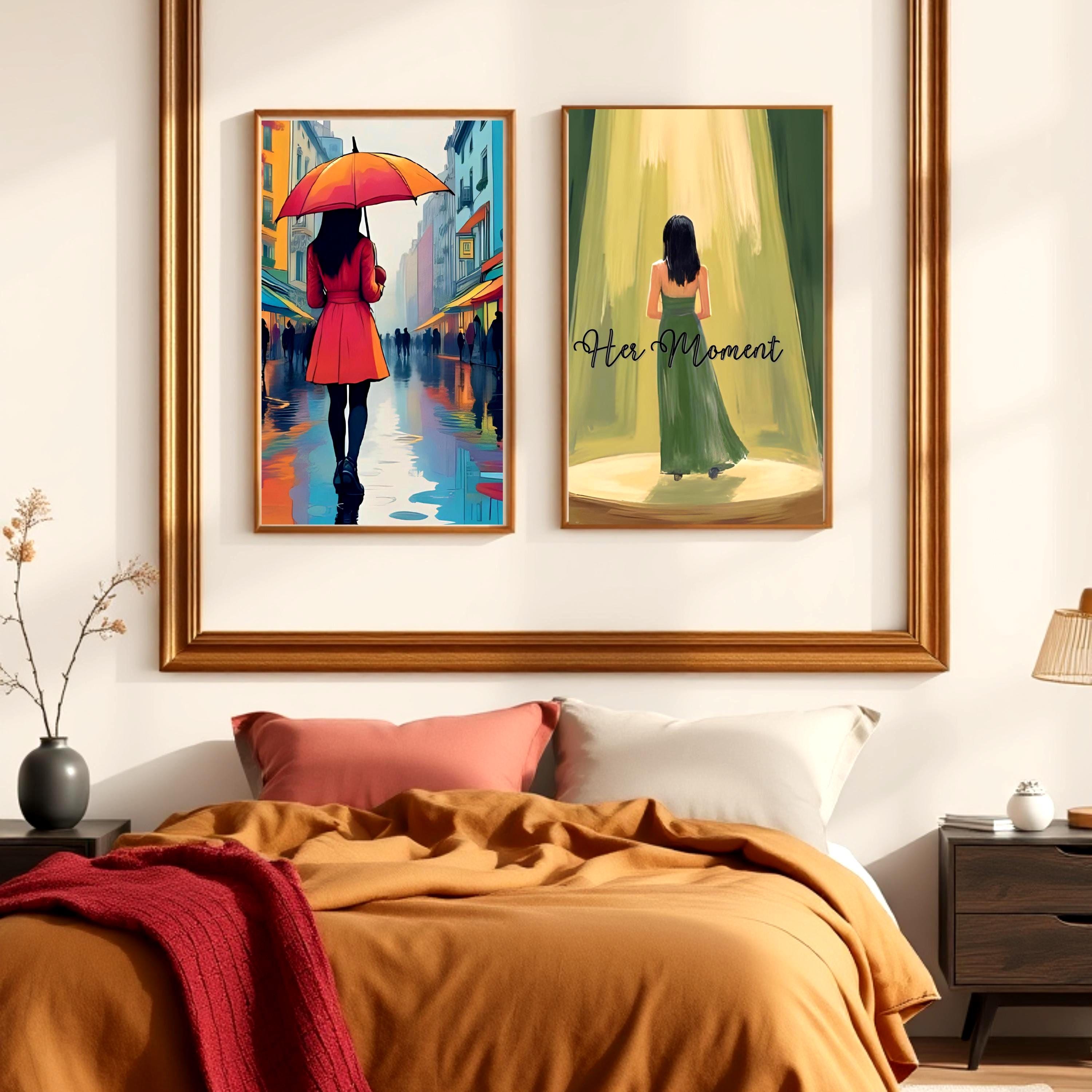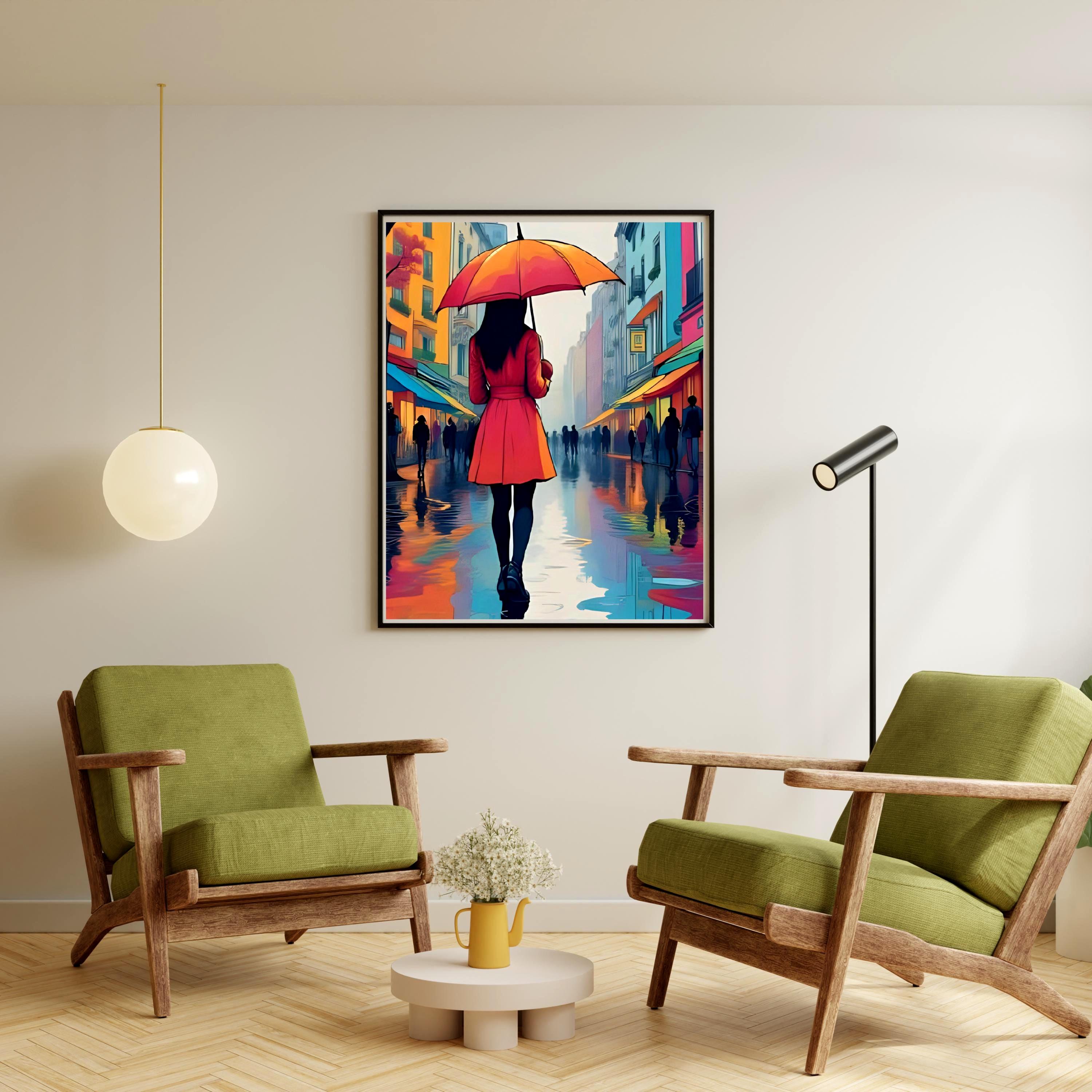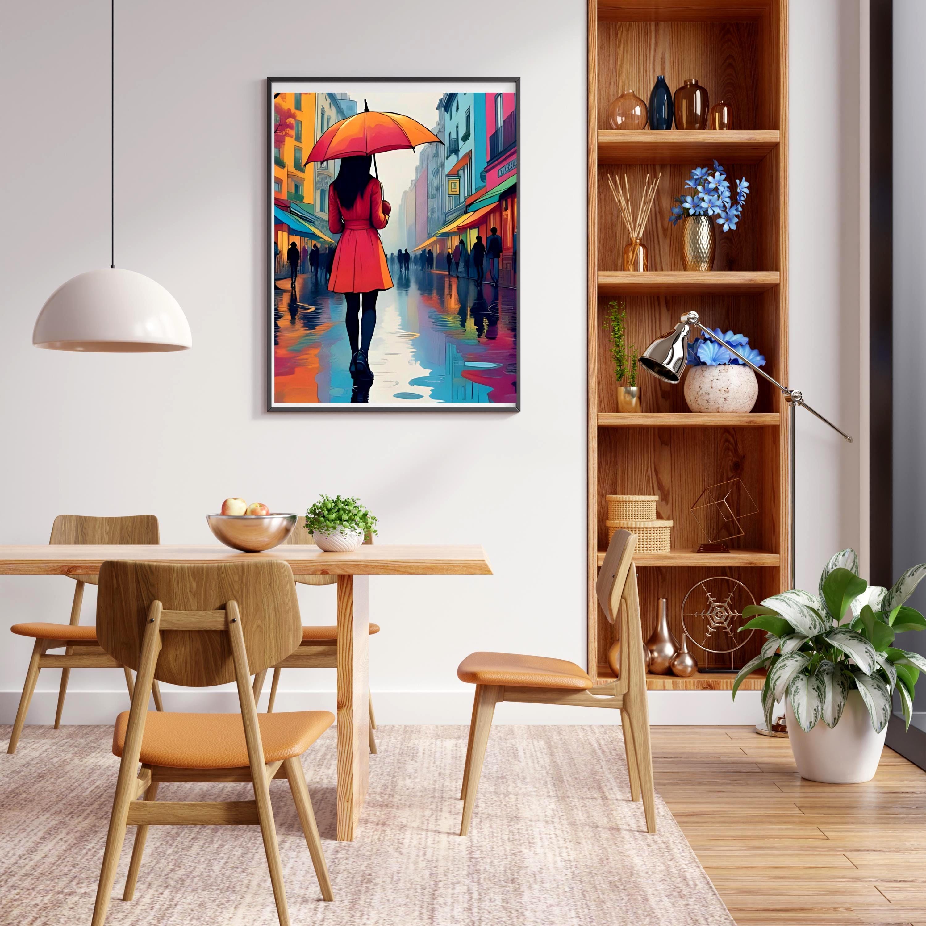 Transform your bedroom wall with this stunning rainy city art print featuring a vibrant red coat and umbrella illustration that captures the beauty of an urban scene in the rain. This modern print showcases a colorful rain artwork with reflective pavement details, creating a captivating digital wall decoration that adds depth and atmosphere to any space. This painting brings the charm of a rainy cityscape into your home with its artistic representation of urban life.