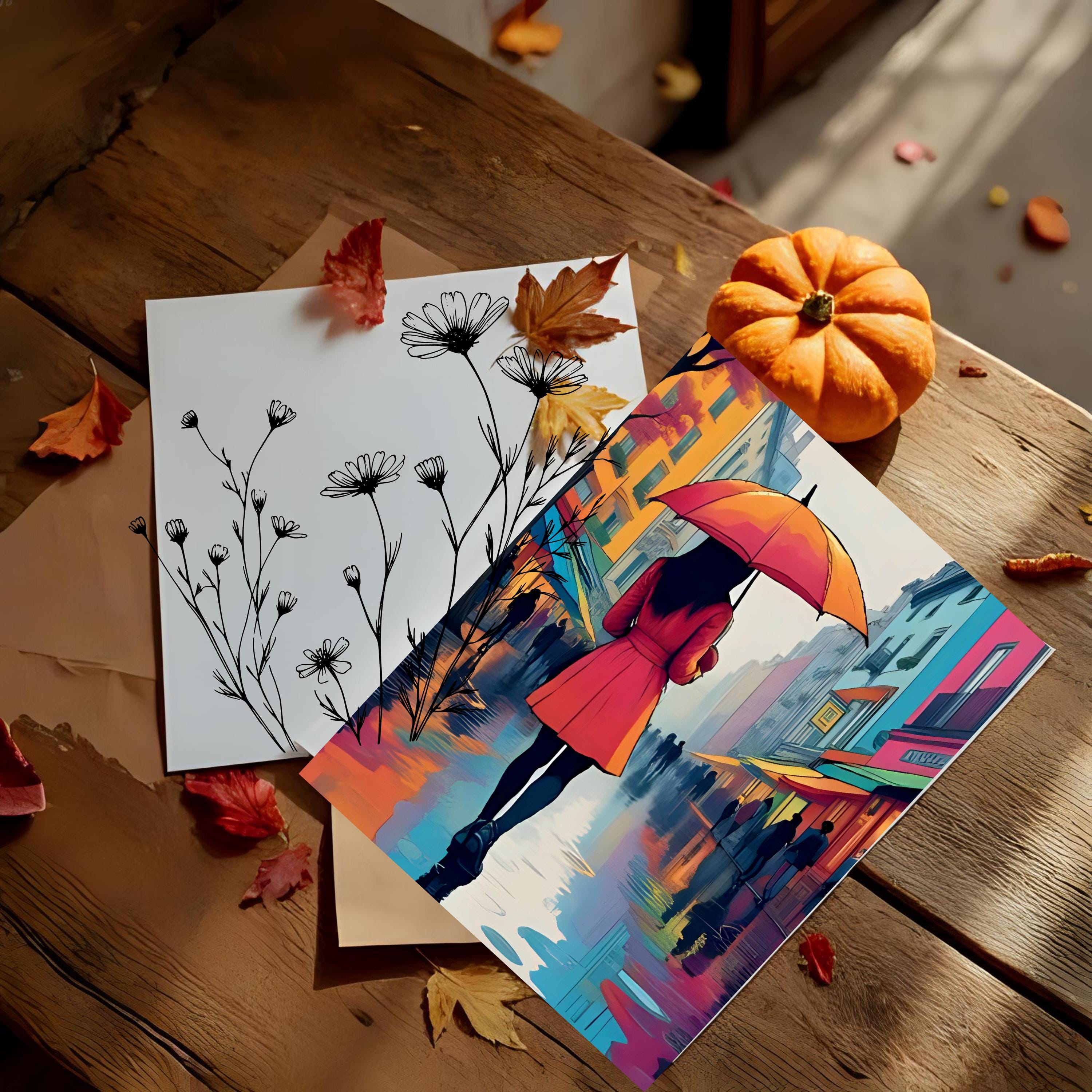 * Striking digital artwork featuring a person in a red coat holding an orange umbrella against a rainy cityscape