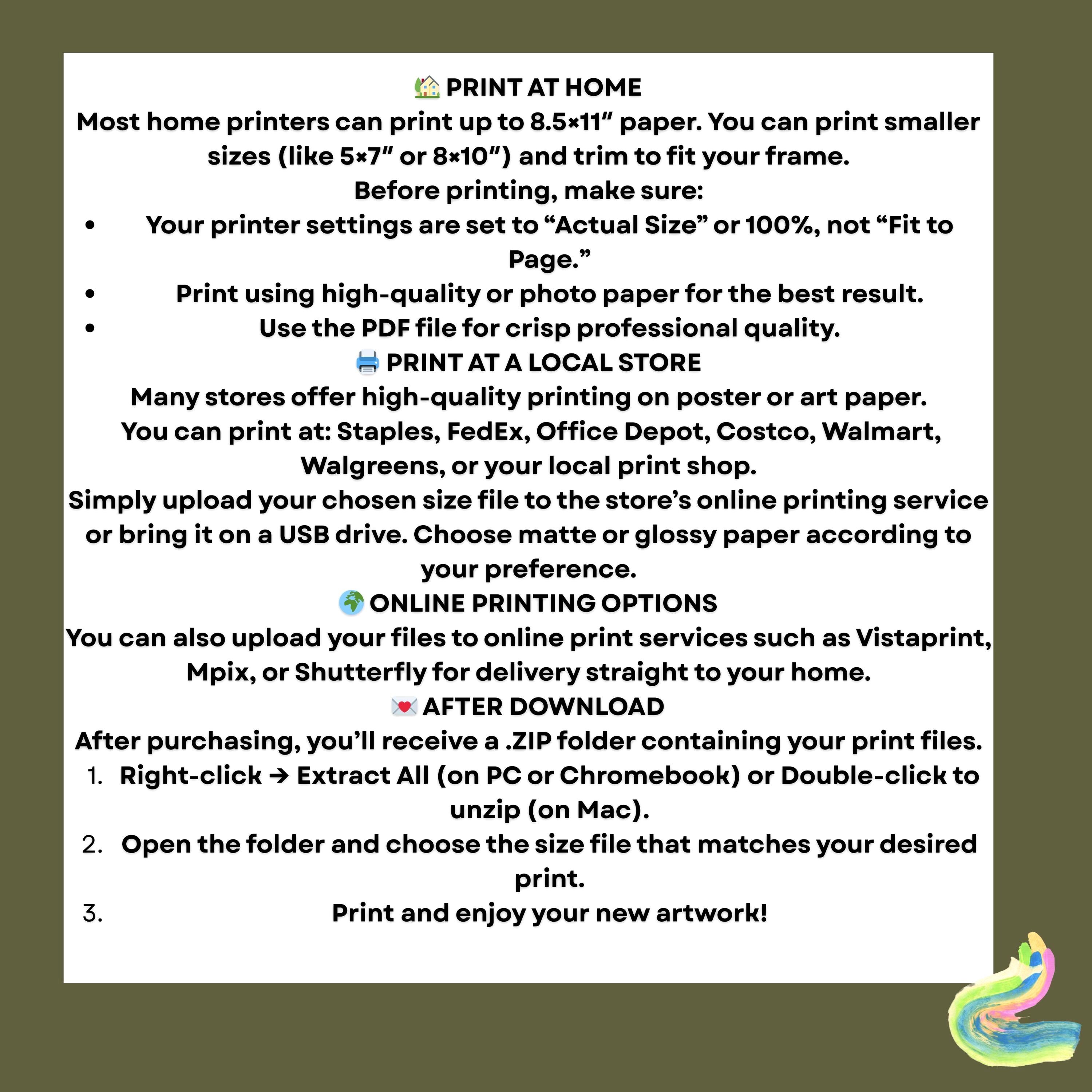 * Instant download allows for immediate printing at your preferred size and frame selection.