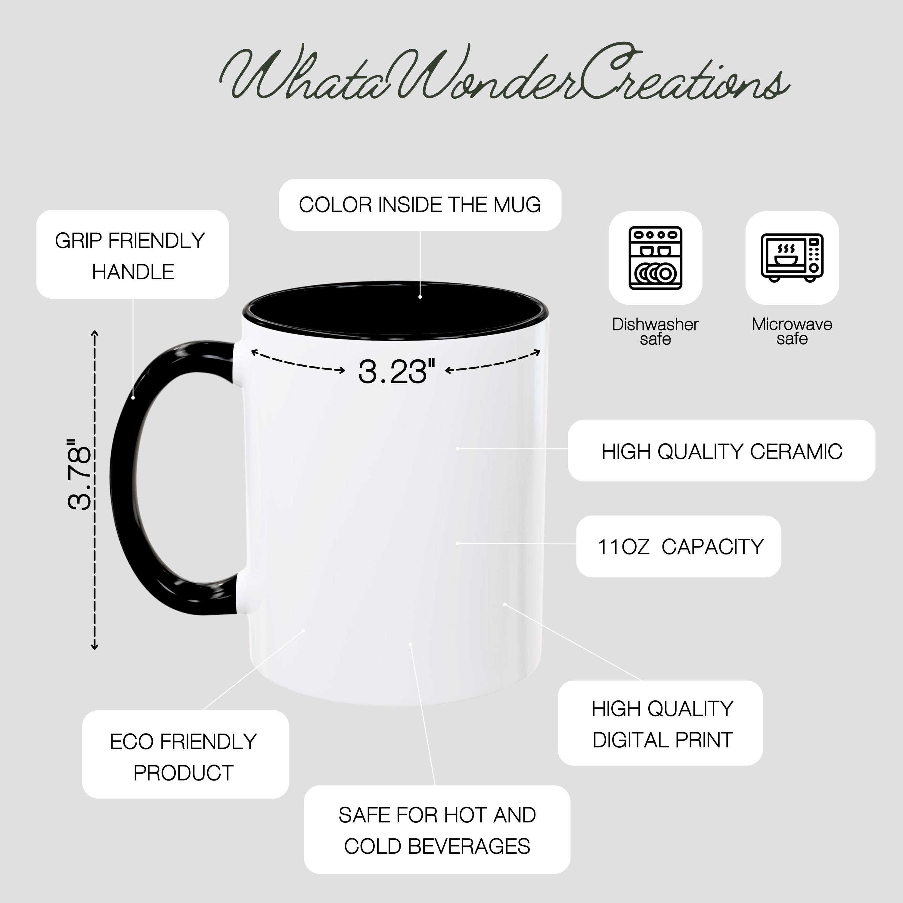 • 11oz ceramic mug with striking white exterior and contrasting black interior/handle