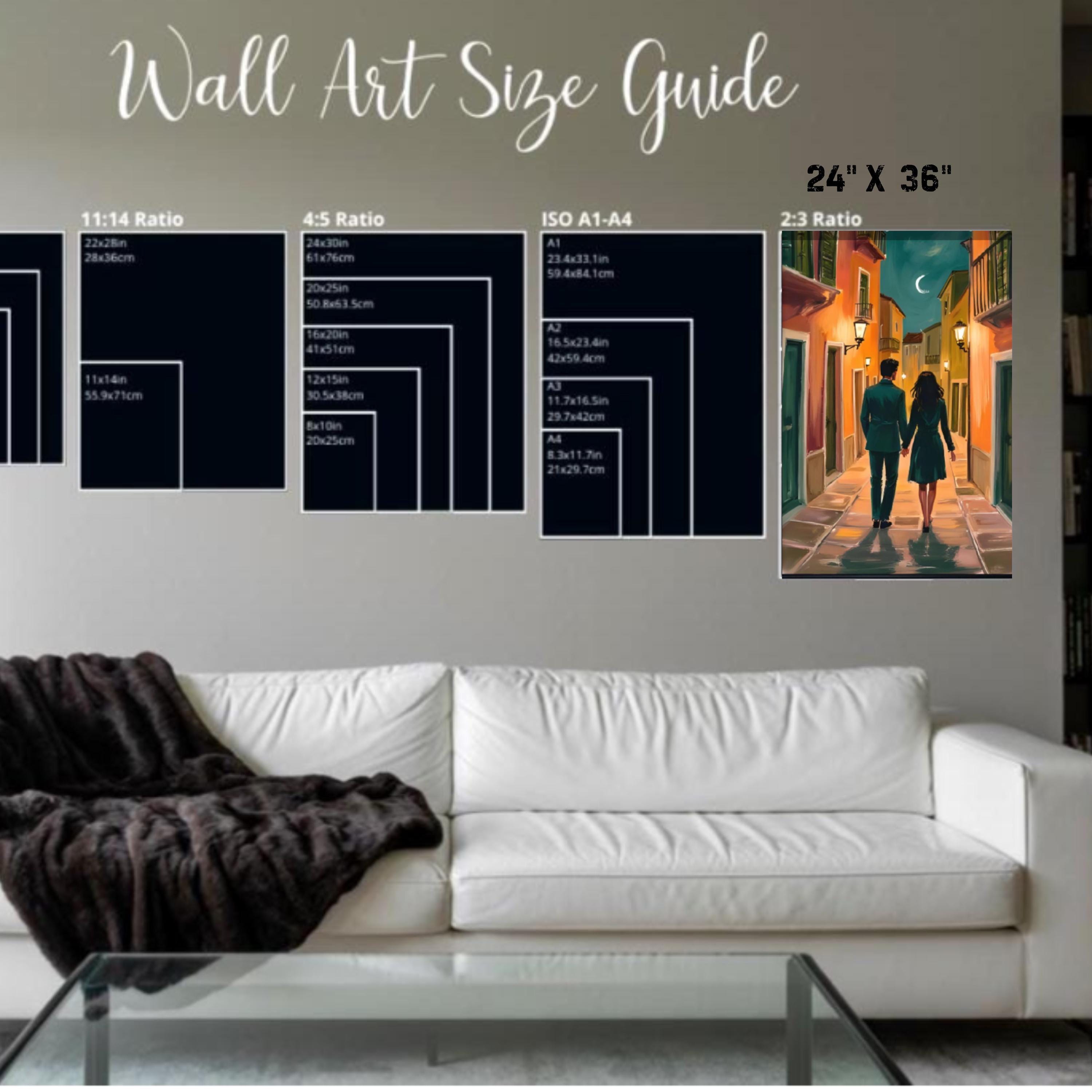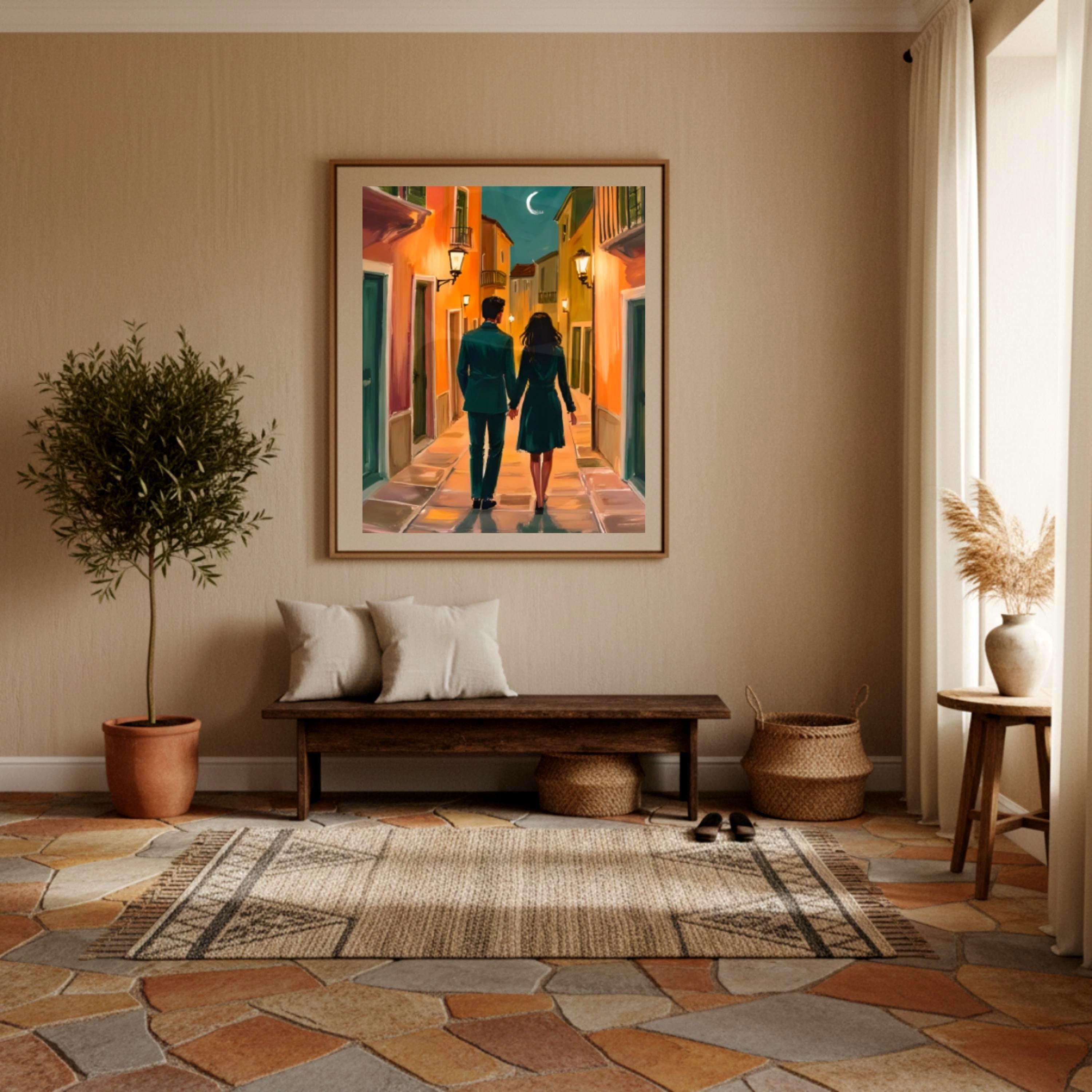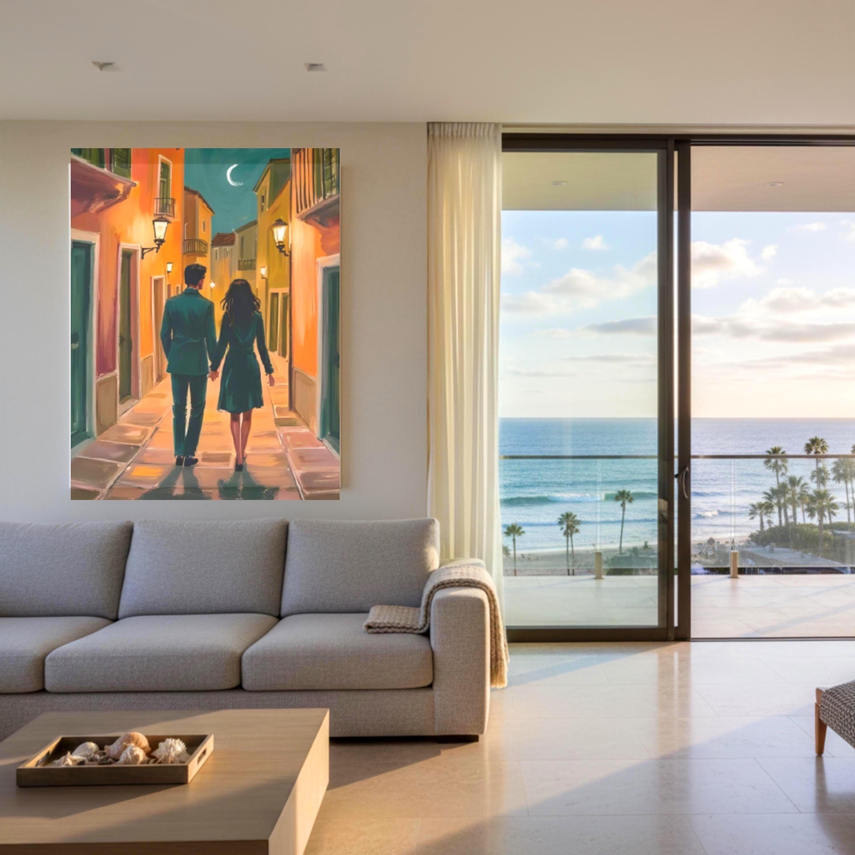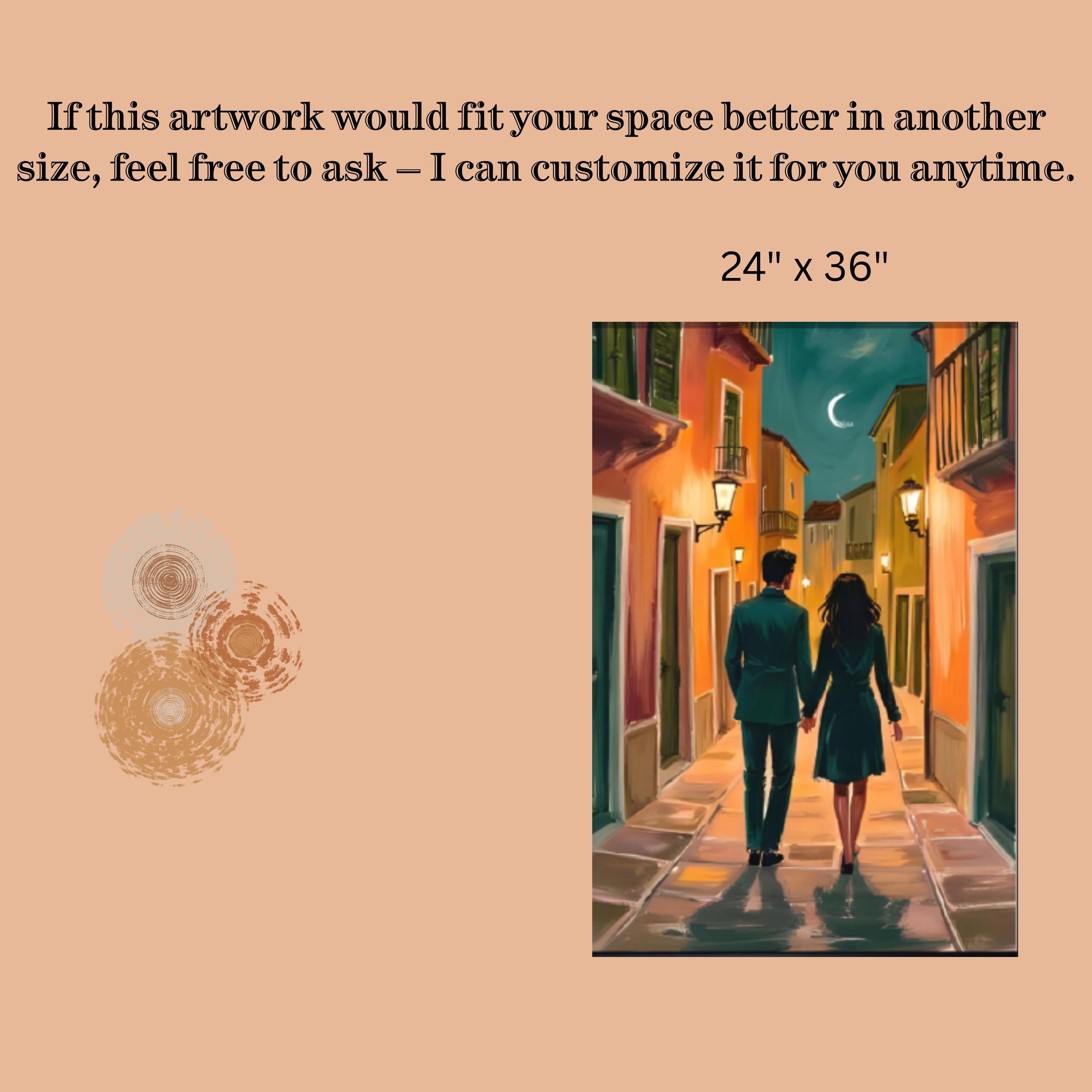 This romantic couple artwork portrays an elegant walking celebration on a European street scene, making it the perfect anniversary gift wall art for your special someone. The large format bedroom print captures a beautiful painting of a couple's intimate moment, ideal for showcasing your love story through sophisticated wall art.