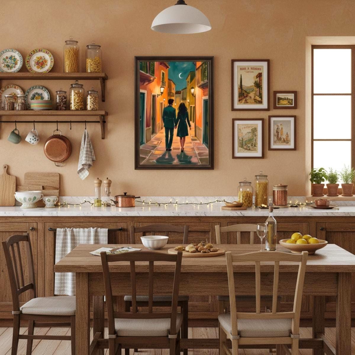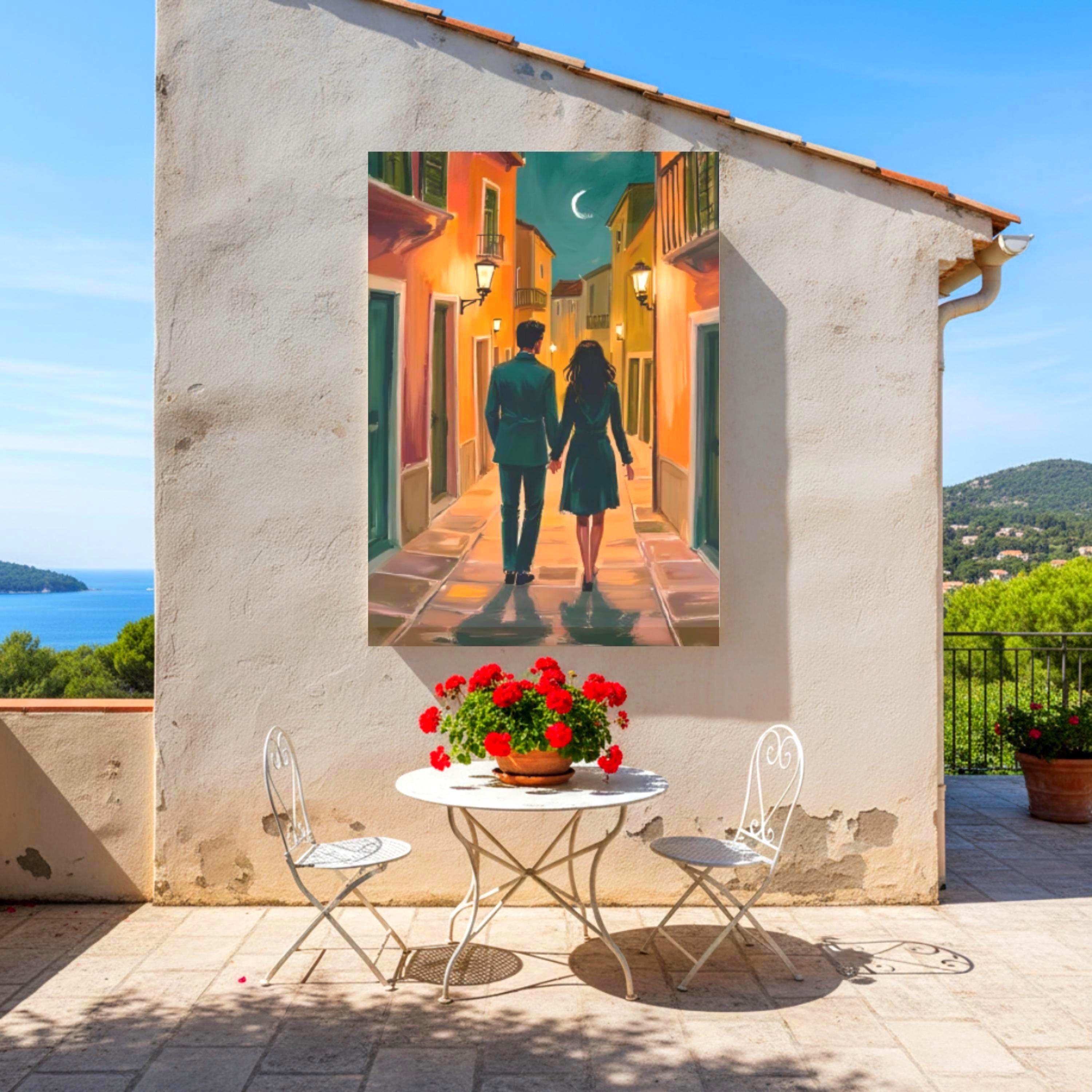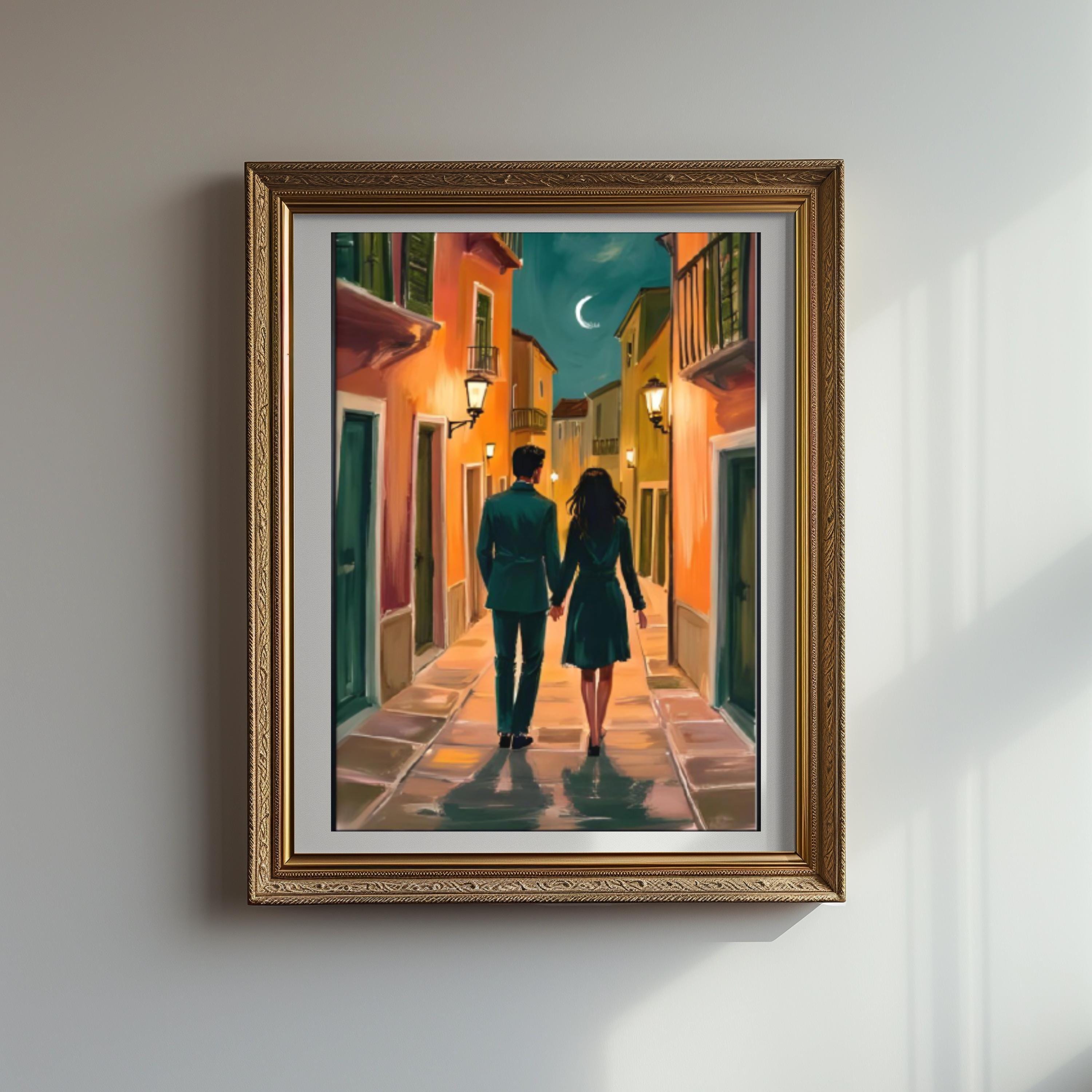 • Heartfelt artwork depicting a couple strolling together under warm lights on a charming European street scene