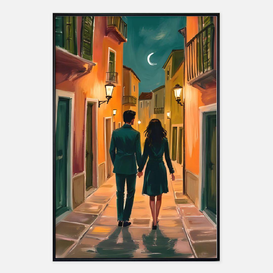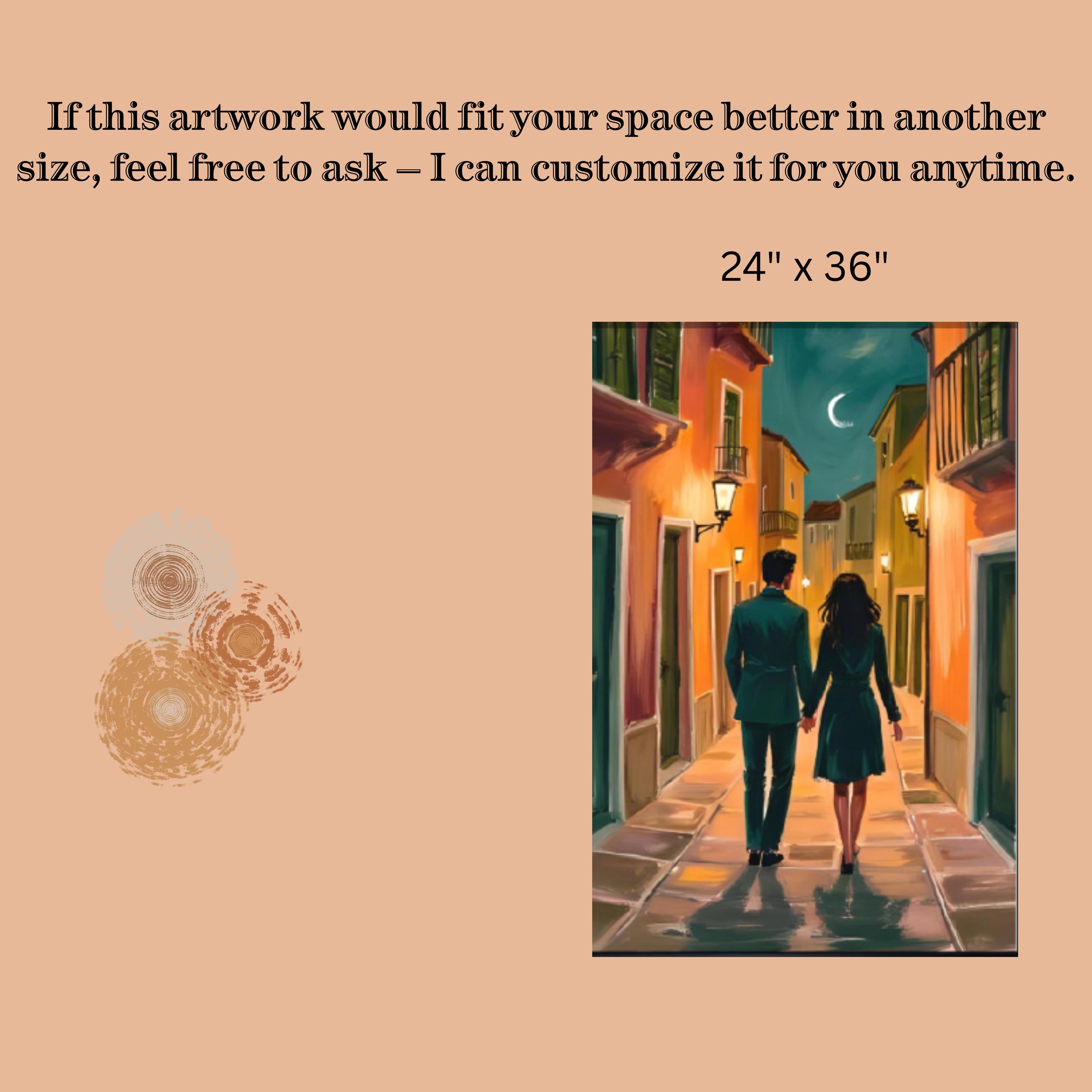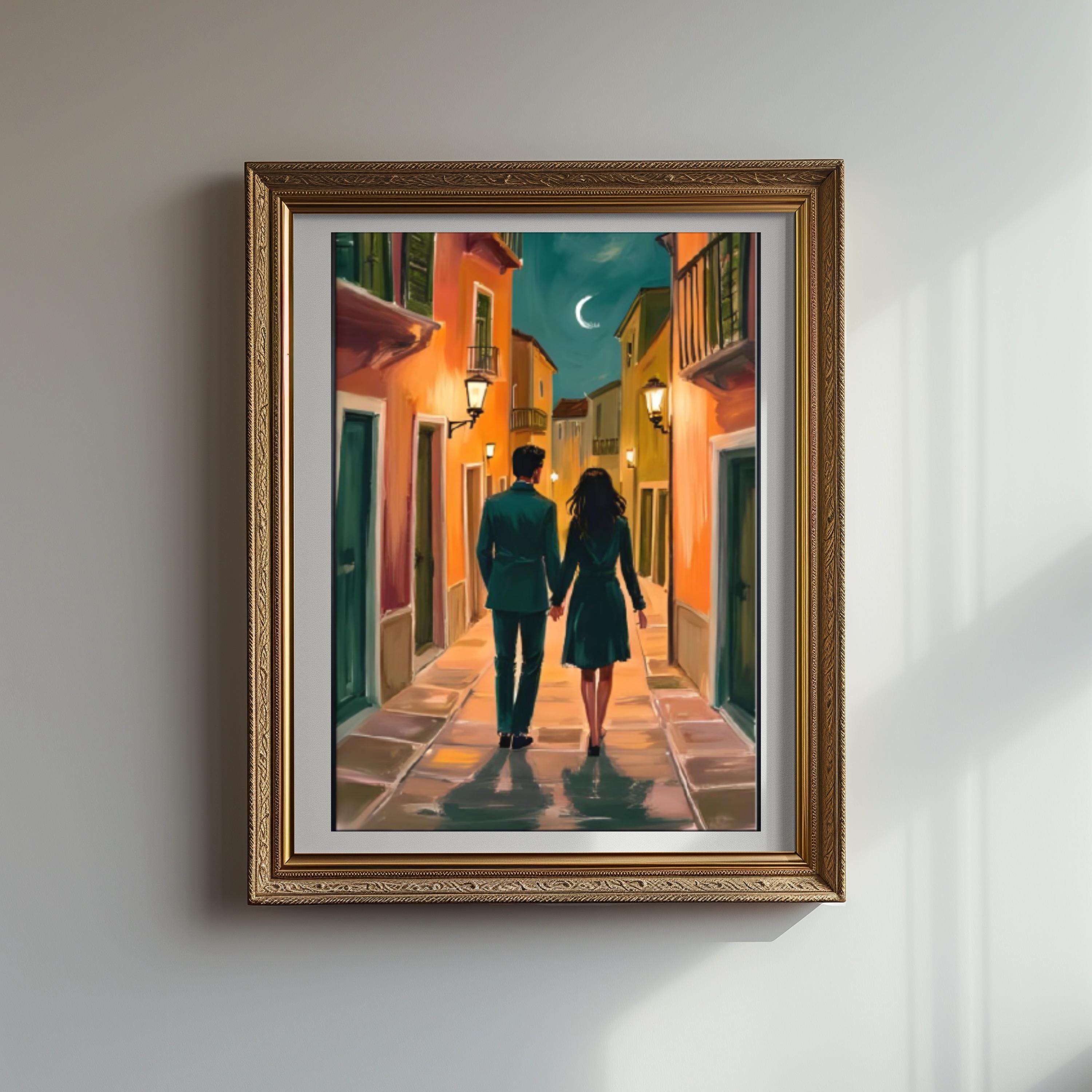 • Stunning nighttime scene depicting a couple walking through a colorful European-style alleyway under a crescent moon