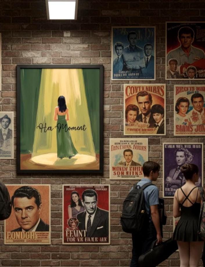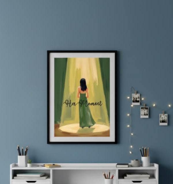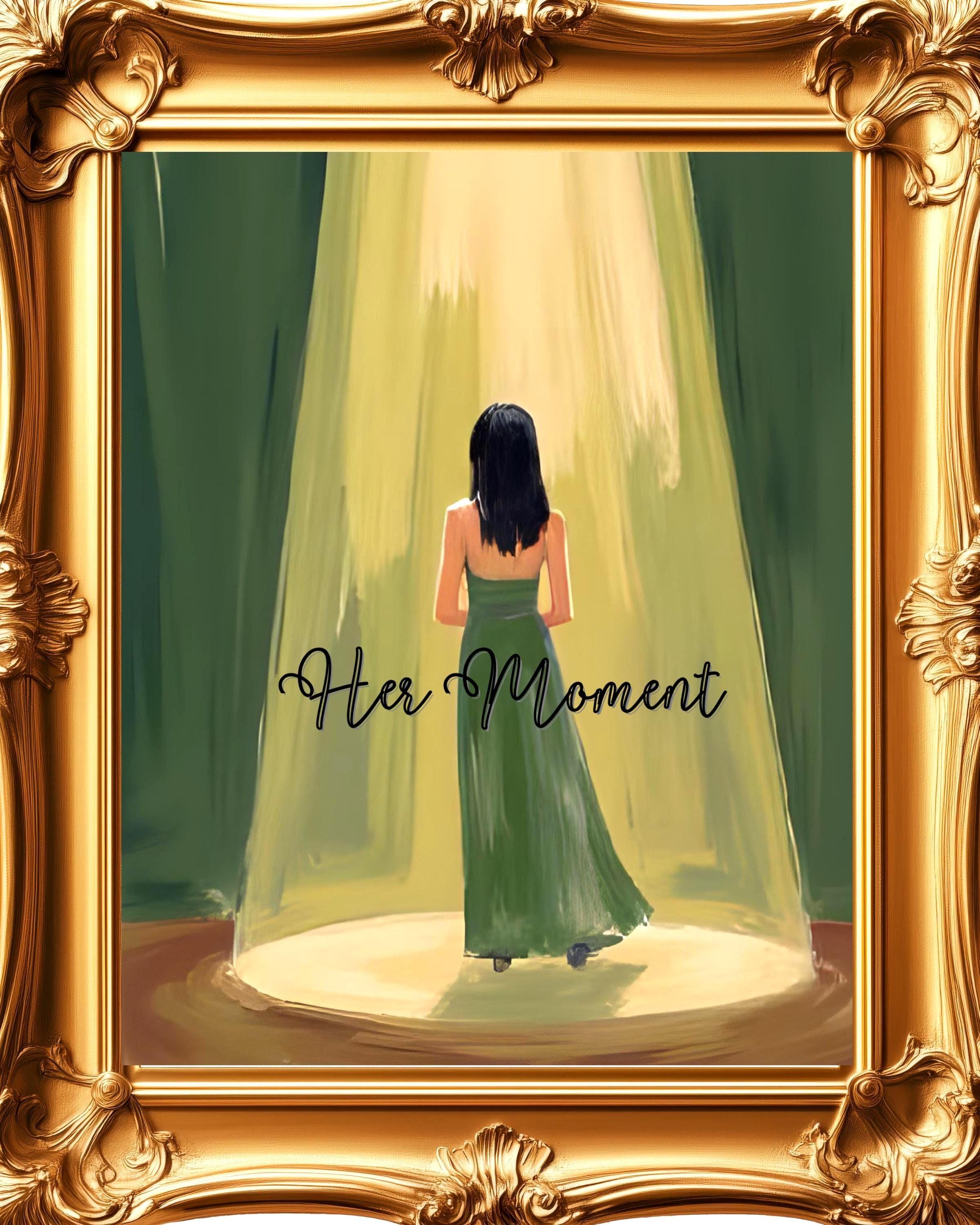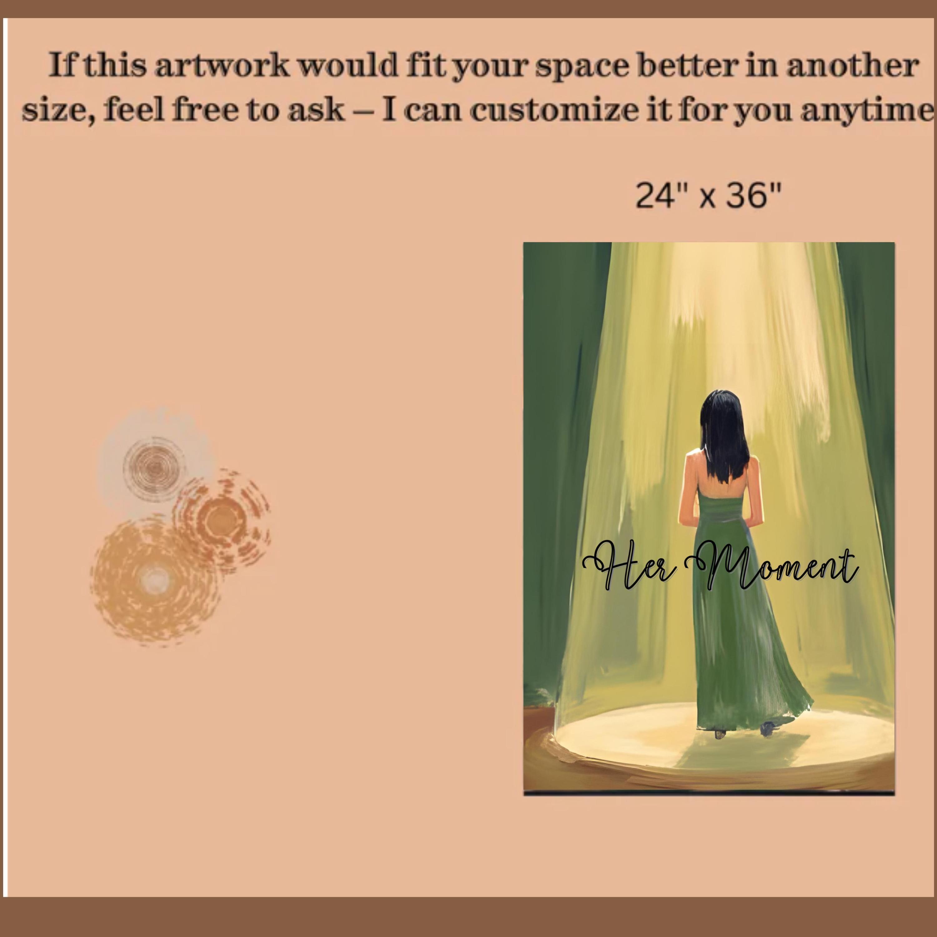 • Fine art digital print featuring a woman in a green dress standing dramatically in a beam of light, perfectly capturing the anticipation and emotion of a stage performance