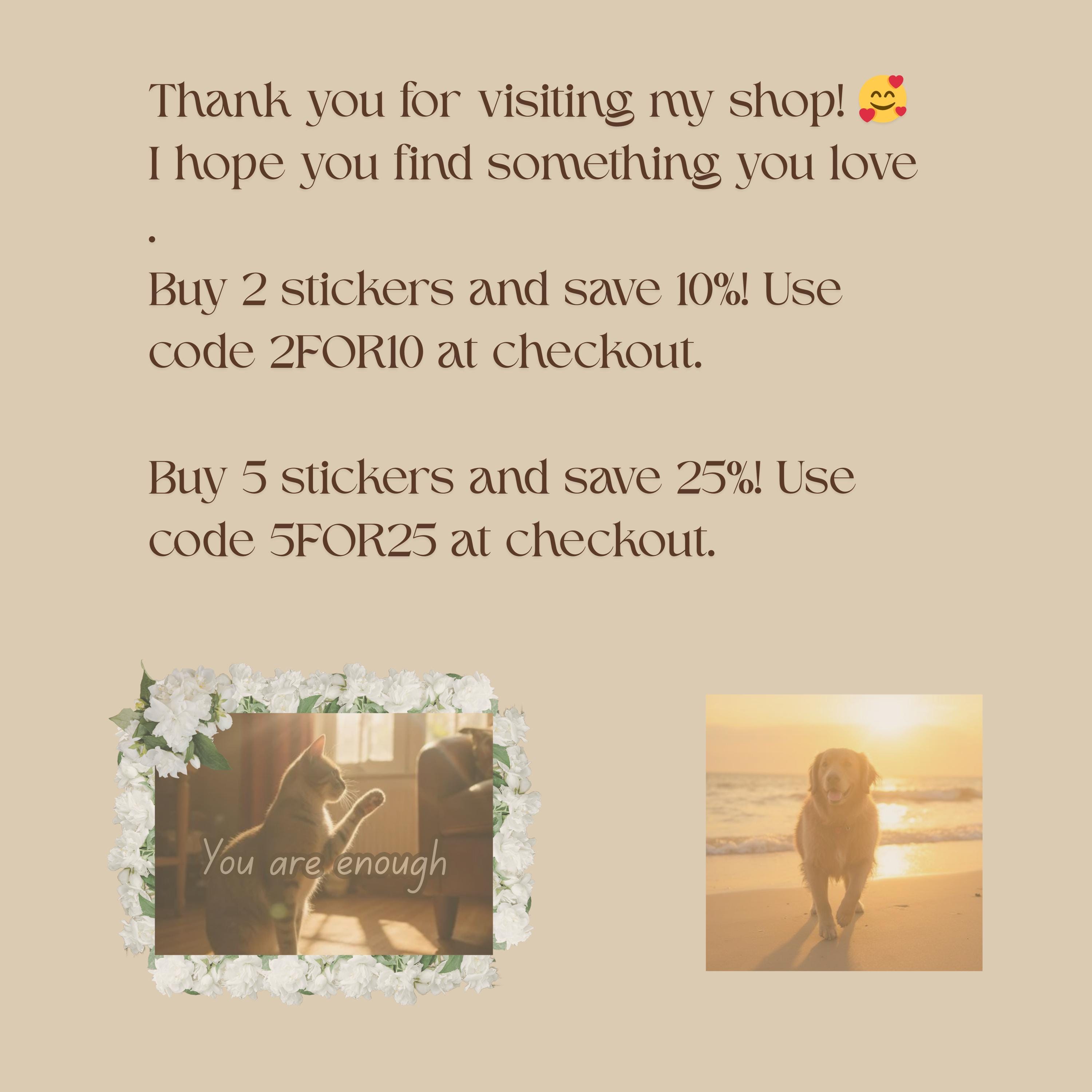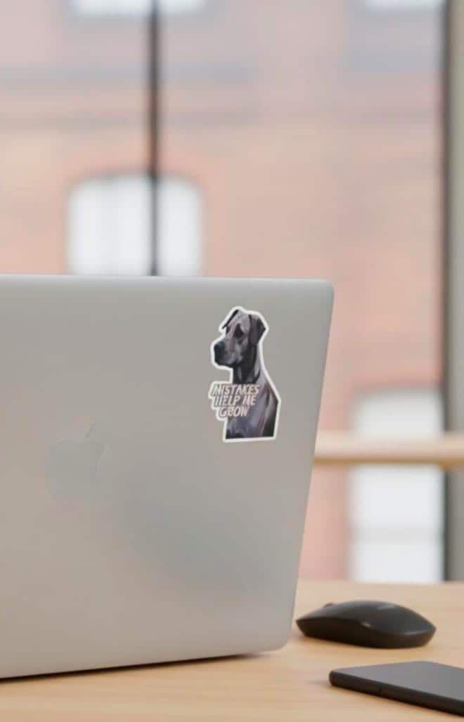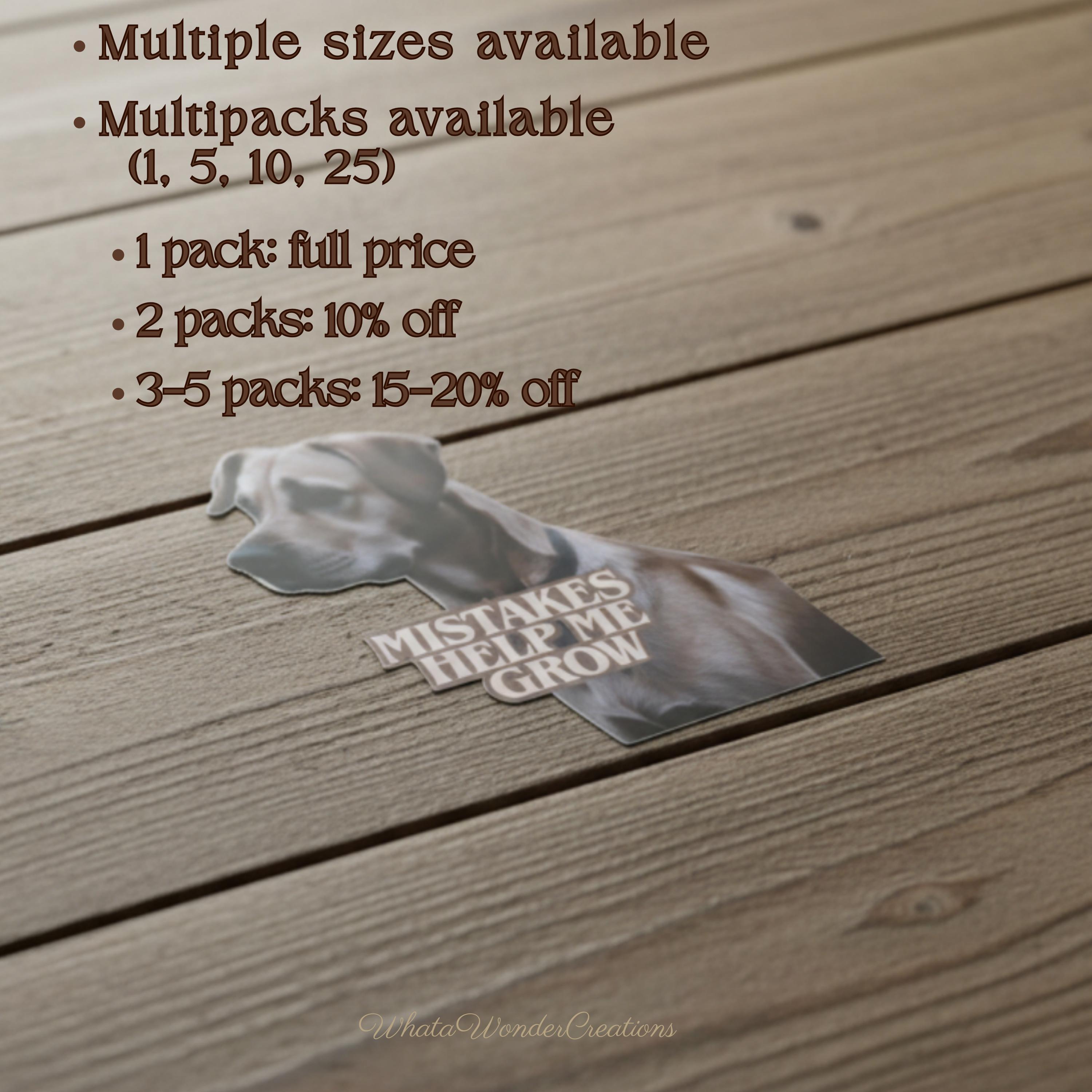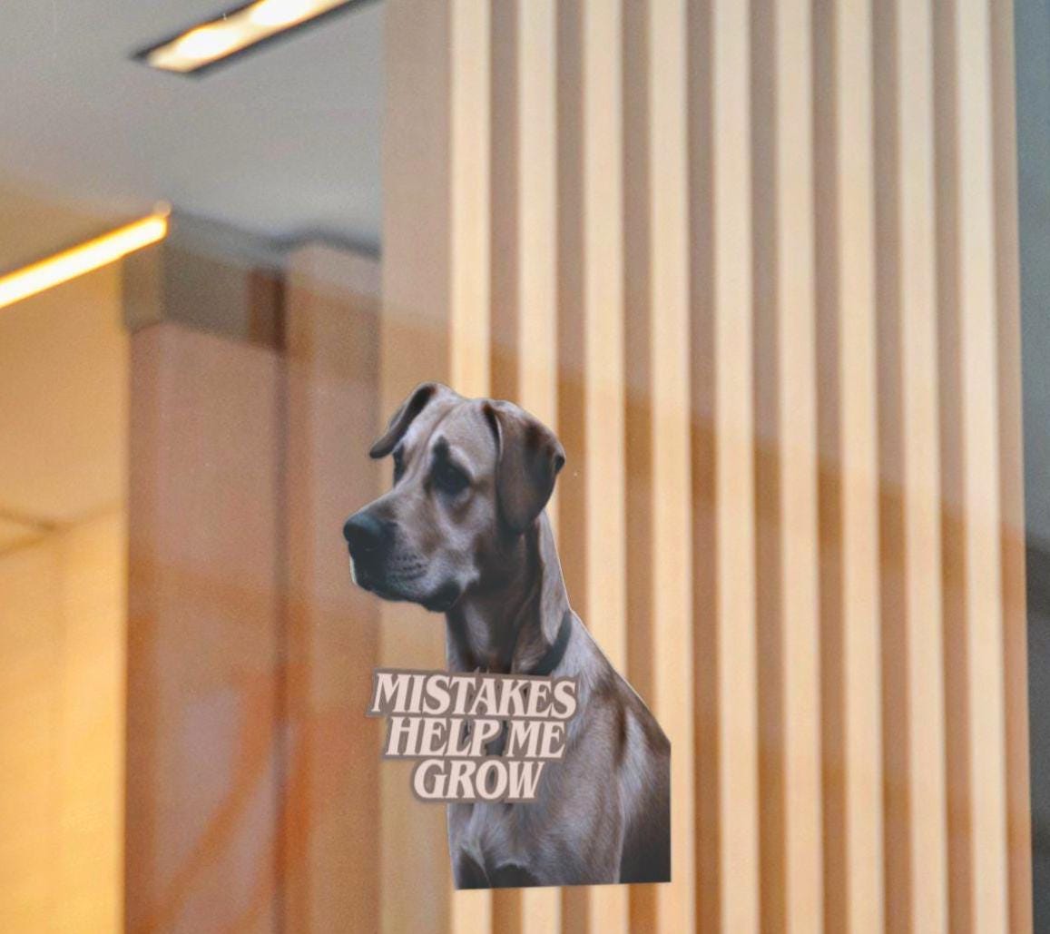A small, die-cut transparent sticker featuring a soulful dog portrait with the uplifting phrase “Mistakes Help Me Grow.” The matte, UV-protected finish keeps the soft, muted tones true while protecting against scratches, sunlight, and water. Designed with DTF printing on durable transparent film, this sticker blends seamlessly on glass, metal, and other smooth surfaces — a quiet reminder of resilience that looks right at home on laptop lids, water bottles, windows, or phone cases. Choose from many sizes and bundle options to place these hopeful accents around your space or share them with friends who appreciate gentle, animal-centered encouragement.