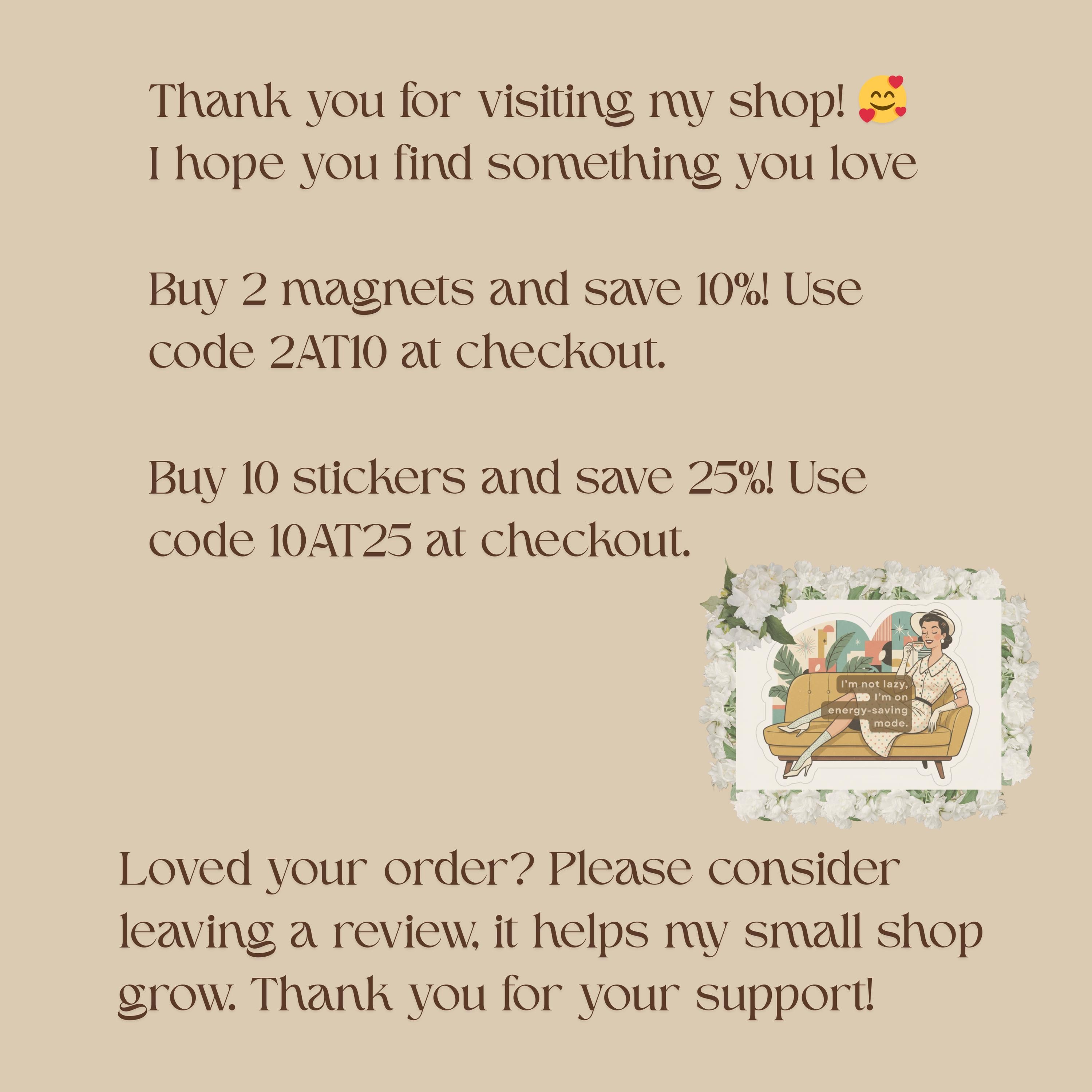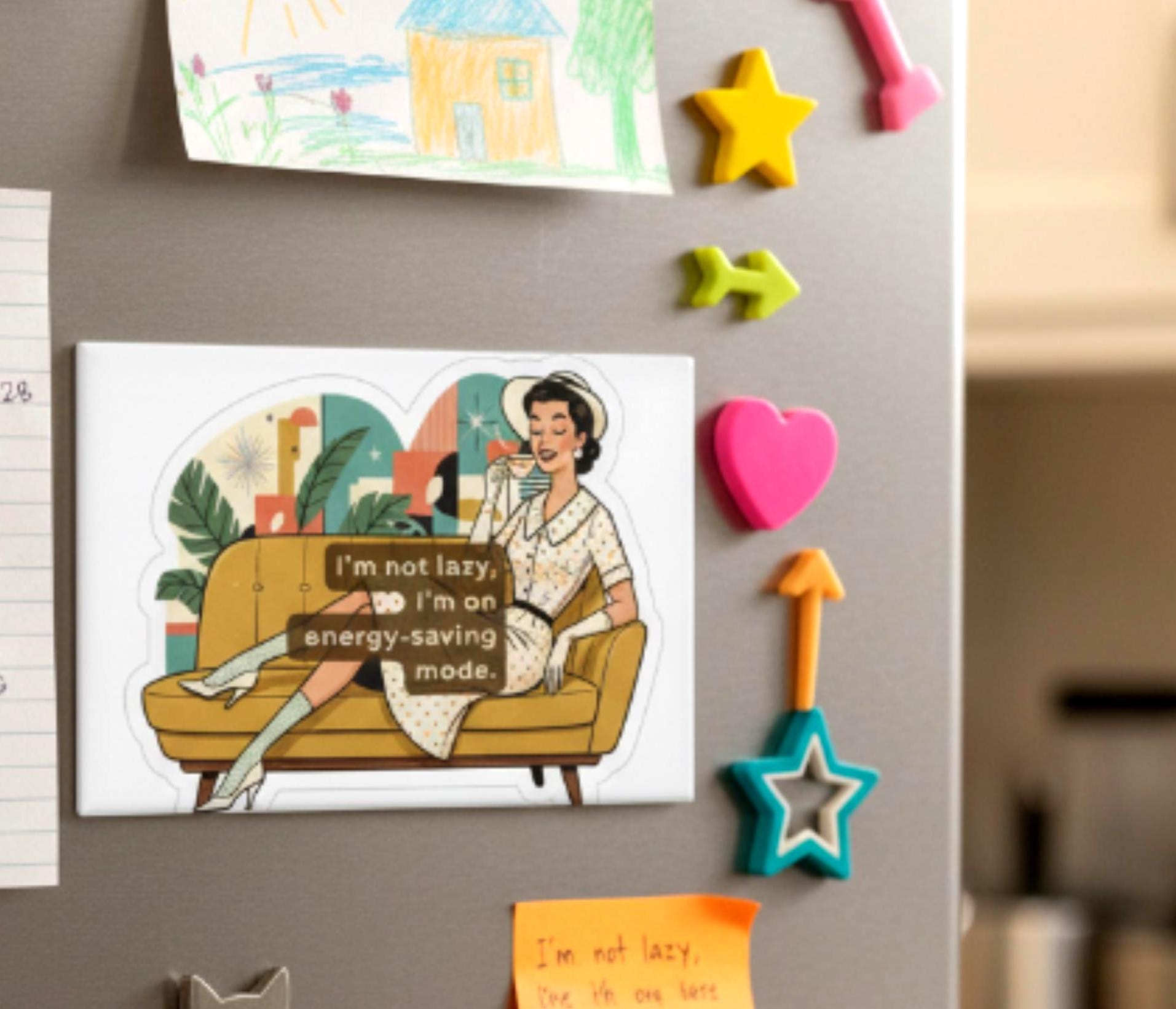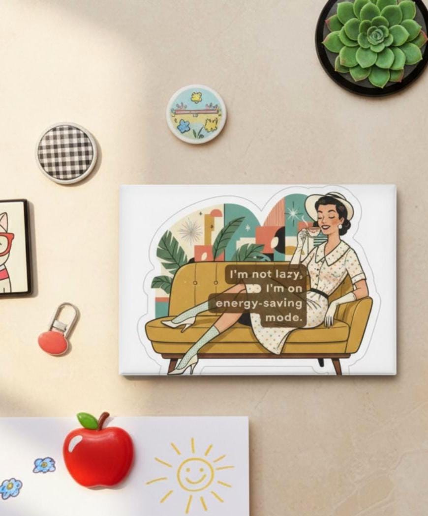 Bring a slice of cozy mid-century humor to any metal surface with this rectangular button magnet. A relaxed, vintage-style woman lounges on a mustard sofa beneath the cheeky line “I’m not lazy, I’m on energy-saving mode.” Warm, muted tones and clean linework give the piece a homey, nostalgic feel while crisp, fade-resistant printing and a clear mylar/UV cover keep the artwork bright and scratch-free. The sturdy metal shell and flat magnetic back let it sit flush and steady on fridges, lockers, or office boards — a small, confident accent that sparks a smile and adds personality to everyday spaces.